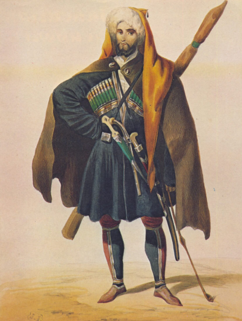 Вооружение кавказского горца издавна состояло из оборонительного доспеха – кольчуги, шлема, наручей и из наступательного оружия – лука со стрелами, копья, дротика, сабли и кинжала. В XVIII в. распространилось огнестрельное оружие, и некоторое время лук и стрелы, ружье и оборонительный доспех сосуществовали. Со временем огнестрельное оружие заменило лук и стрелы, а оборонительный доспех перестали применять, так как пули его пробивали. Комплект вооружения горца со второй половины XVIII в. состоял из ружья, пистолета, сабли или шашки, кинжала.