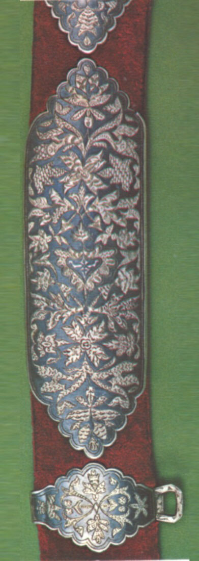 Владикавказ, дагестанский мастер, 1896 1897 гг. Клинок кинжала кованый, прямой, с одним глубоким долом. На левой стороне клинка — картуш с арабской надписью ’’Базалай”, являющийся поддельным клеймом знаменитого дагестанского мастера середины XIX в., клинки которого славились на Кавказе и в России. Рукоять сплошь оправлена в серебро и имеет головку северокавказской формы, закреплена двумя заклепками с серебряными выпуклыми полусферическими шляпками, справа и с боков украшена глубокой гравировкой с позолотой, обрамленной дополнительно рядами ложной зерни. Ножны серебряные, покрыты глубокой гравировкой, чернью, позолотой и ложной зерныо. Вверху и внизу ножен в круглых картушах арабская надпись: "Владелец Хасан. 1314” (дата по мусульманскому летоисчислению, соответствует 1896 1897 гг.). Орнамент рукояти и ножен типично кубачинско-лакский, состоящий из спирально переплетенных друг с другом стеблей с обращенными вовнутрь листьями и лепестками. В орнамент включены небольшие черневые розетки. Серебро имеет пробирные клейма г. Владикавказа 1873-1898 гг., где работало много мастеров-отход-ников из Дагестана.