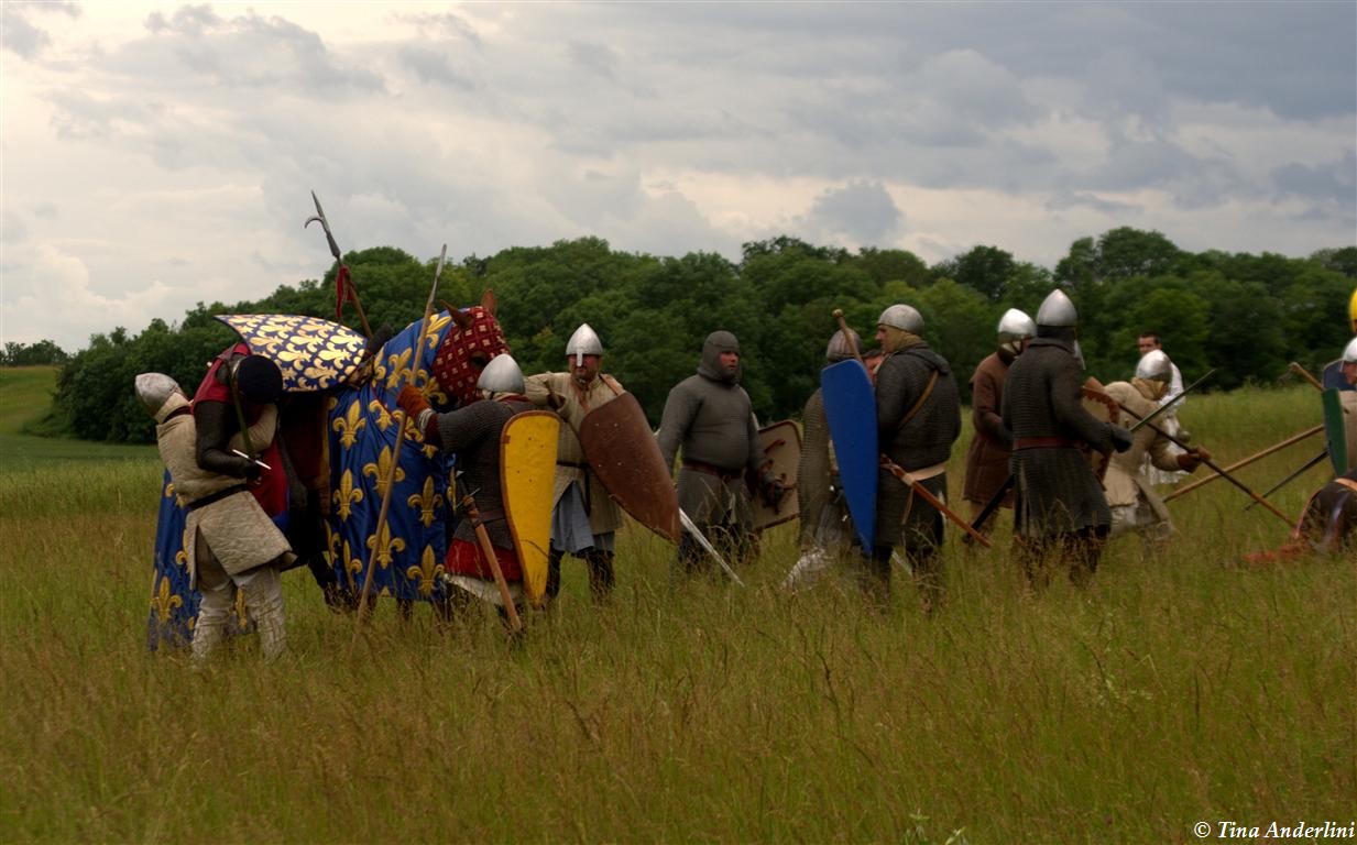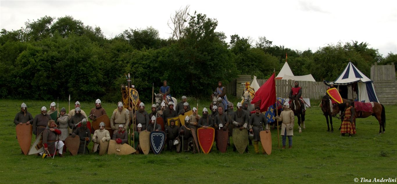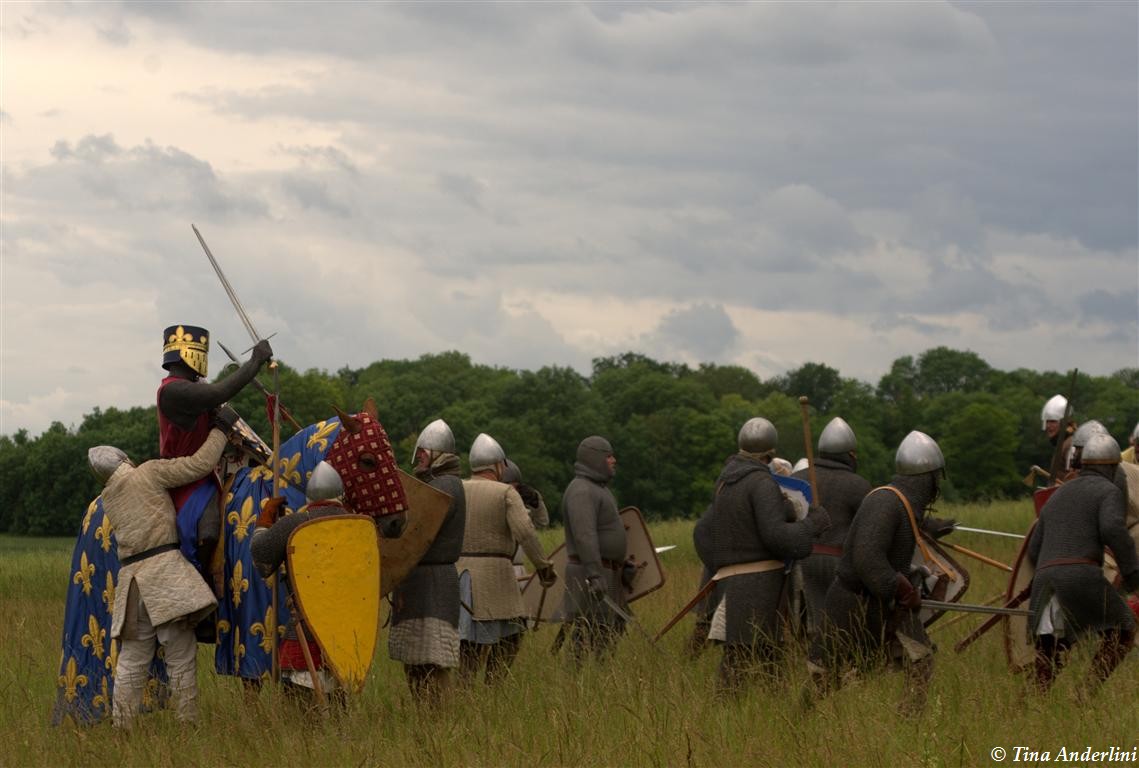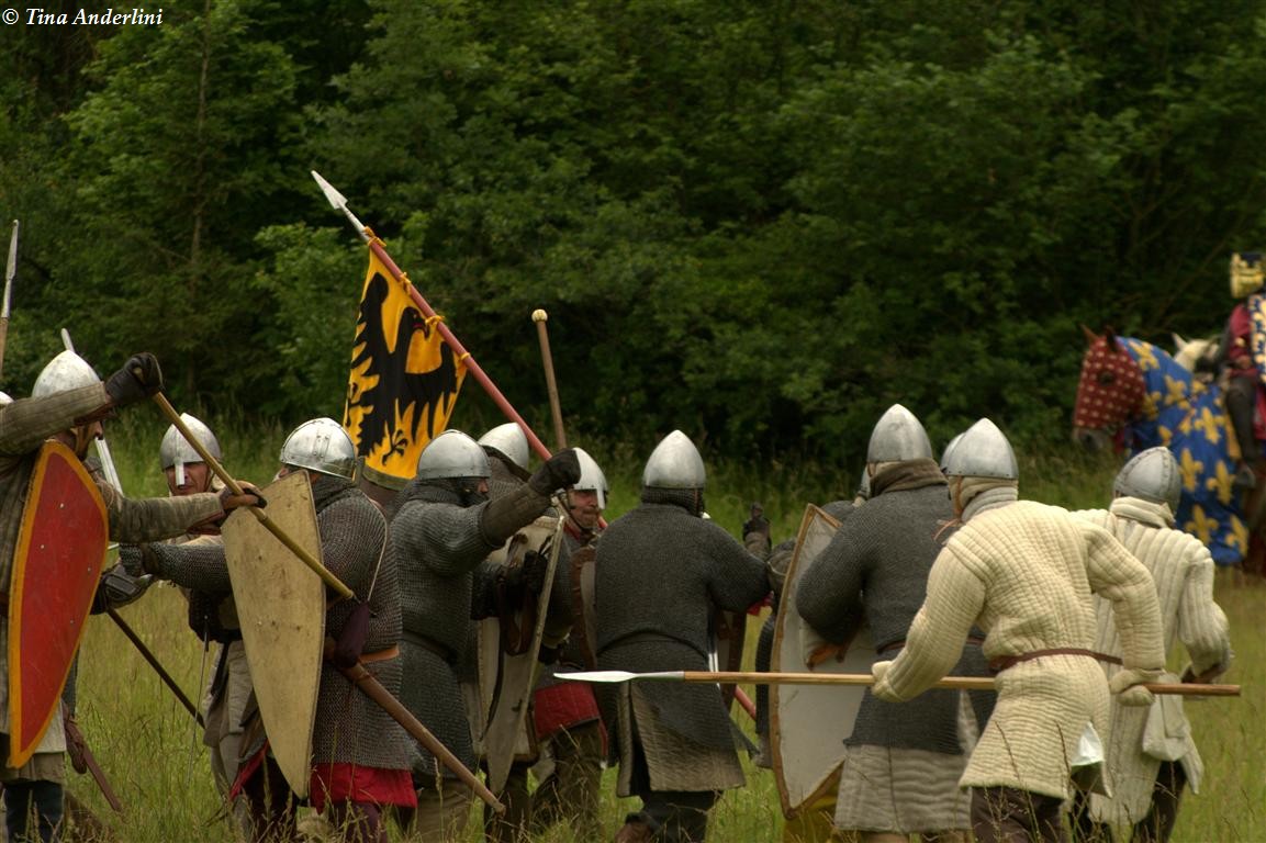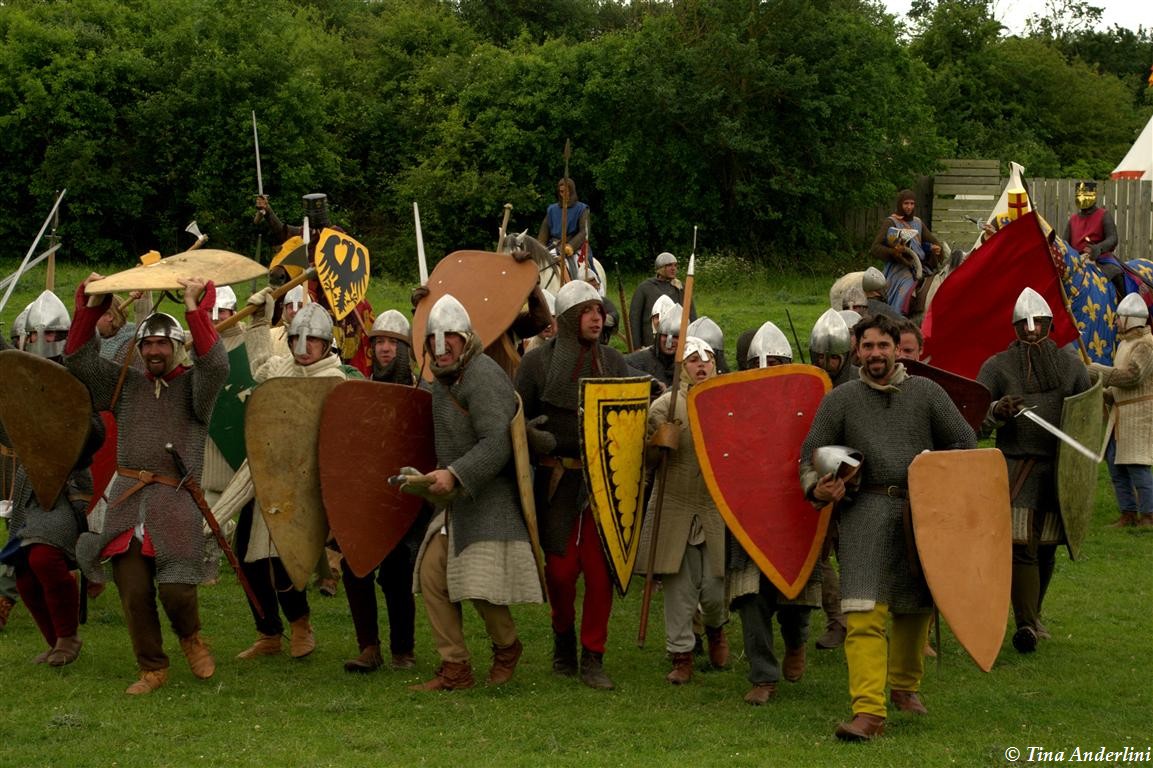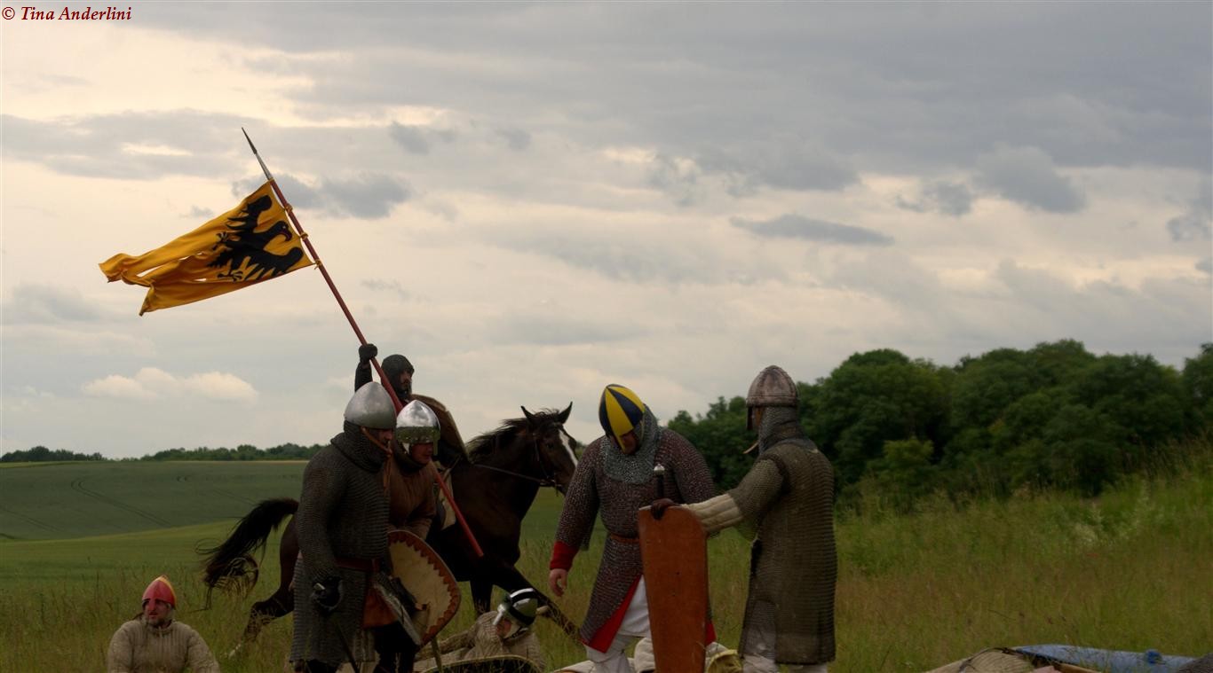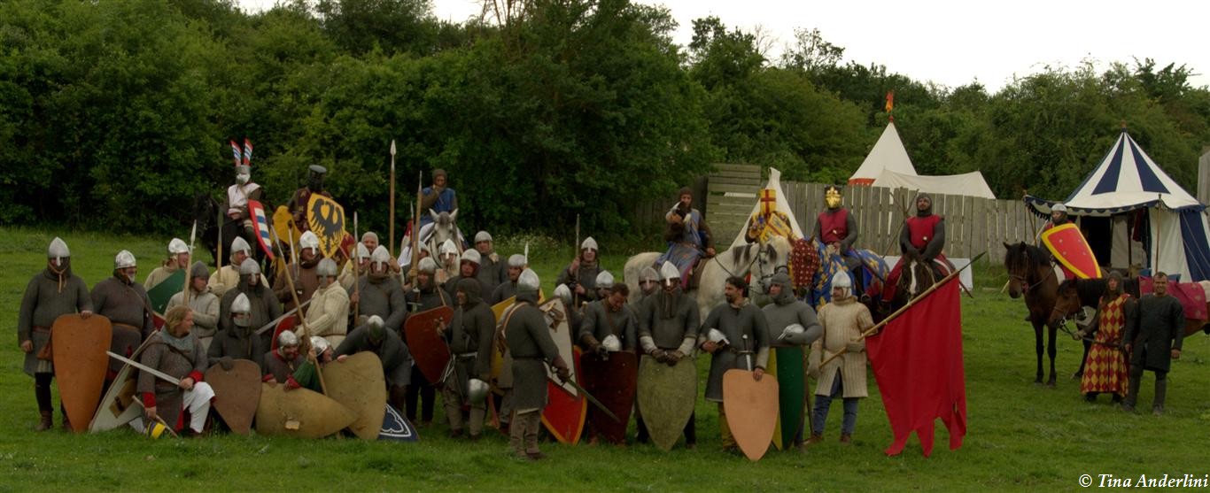 Фестиваль Битва при БувинеБитва при Бувине – сражение 27 июля 1214 года между войсками французского короля Филиппа II Августа и англо-фламандско-немецкой коалиции, возглавляемой императором Священной Римской империи Оттоном IV. Завершилась победой французов и усилением королевской Франции. Конница противников была построена отдельными колоннами. Пехота (лучники, копейщики) располагались впереди рыцарей. В задачу пехоты входило служить живым бруствером для рыцарской конницы. Так, один из отрядов армии Оттона выделил несколько сот пехотинцев, создавших своего рода круг. В ходе сражения рыцари по мере необходимости скрывались в этом «убежище» и приводили себя в порядок. Само сражение протекало в форме отдельных схваток отрядов и групп рыцарей. Никакого общего руководства не было; император и король сражались как рядовые рыцари. Битва закончилась победой французов. В бою отличился епископ-воин Филипп де Дрё. Он пользовался палицей, отказавшись от режущего оружия, как кровоточительного, – согласно каноническим законам, запрещавшим священникам проливать кровь. Цитата из описания битвы при Бувине: «Левое крыло французов долго не могло справиться с войсками Солсбери и Рено Булонского, укрывавшегося в каре своих брабансонов, но положение союзников и здесь было поколеблено атакой, которую произвел епископ Бове со своими милициями. «Страшный епископ», вооруженный палицей, лично поразил Солсбери и многих других неприятельских воинов.» Ниже на фотографиях представлена реконструкция битвы проводимая на фестивале Bouvines 1214, на том месте где 700 лет назад проходило это сражение. Это мероприятие отличает не большое количество участников, а высокий уровень достеверности в исторической реконструкции первой половины 13 века. Одежда, оружие, доспехи, снаряжение всадника и коня отличается большой аутентичностью. Бои постановочные, репетицию боев можно посмотреть на этой странице. Официальный сайт фестиваля: www.bouvines1214.org.