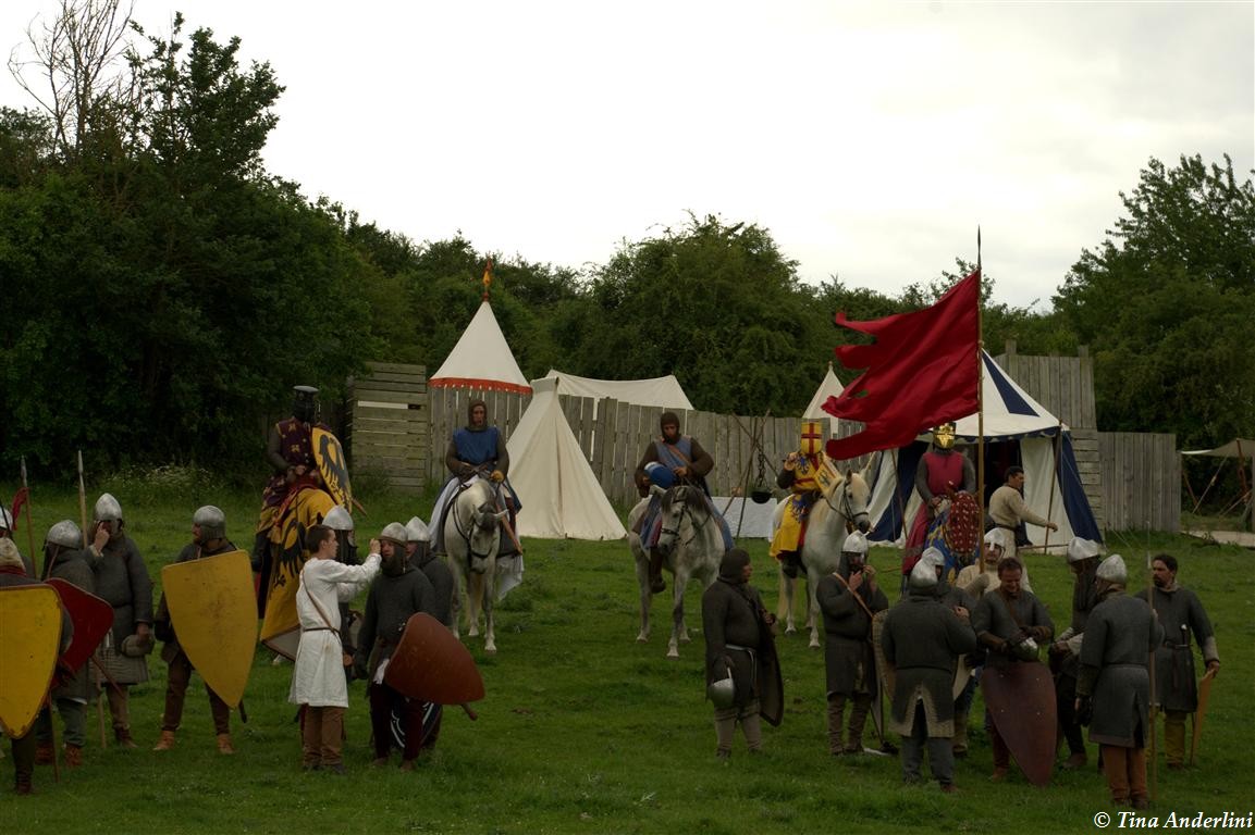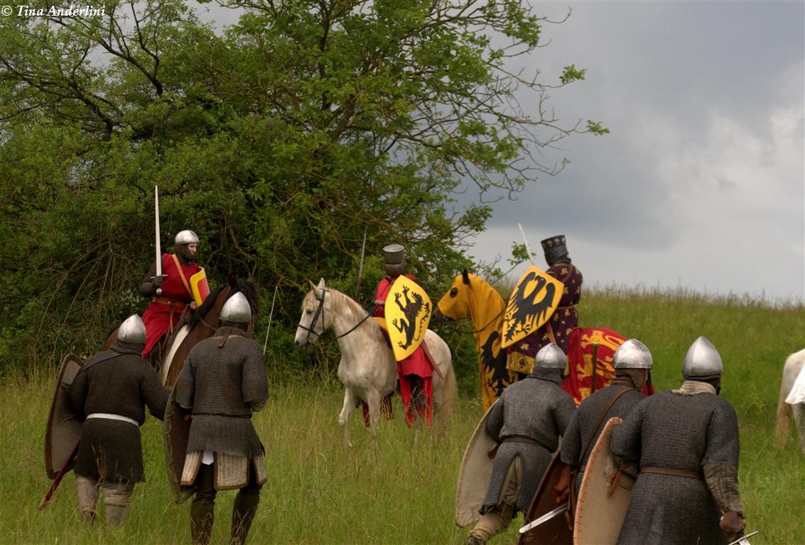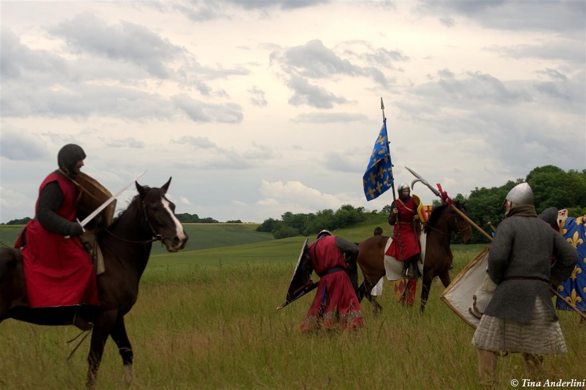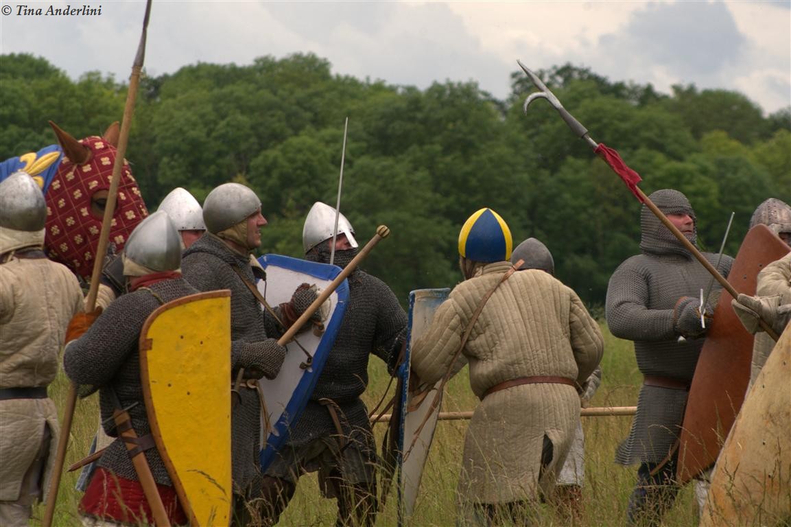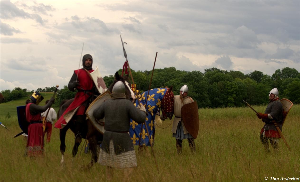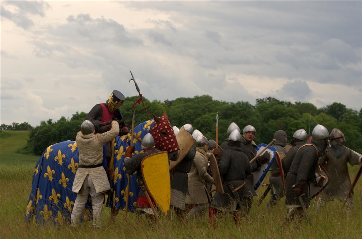 Фестиваль Битва при БувинеБитва при Бувине – сражение 27 июля 1214 года между войсками французского короля Филиппа II Августа и англо-фламандско-немецкой коалиции, возглавляемой императором Священной Римской империи Оттоном IV. Завершилась победой французов и усилением королевской Франции. Конница противников была построена отдельными колоннами. Пехота (лучники, копейщики) располагались впереди рыцарей. В задачу пехоты входило служить живым бруствером для рыцарской конницы. Так, один из отрядов армии Оттона выделил несколько сот пехотинцев, создавших своего рода круг. В ходе сражения рыцари по мере необходимости скрывались в этом «убежище» и приводили себя в порядок. Само сражение протекало в форме отдельных схваток отрядов и групп рыцарей. Никакого общего руководства не было; император и король сражались как рядовые рыцари. Битва закончилась победой французов. В бою отличился епископ-воин Филипп де Дрё. Он пользовался палицей, отказавшись от режущего оружия, как кровоточительного, – согласно каноническим законам, запрещавшим священникам проливать кровь. Цитата из описания битвы при Бувине: «Левое крыло французов долго не могло справиться с войсками Солсбери и Рено Булонского, укрывавшегося в каре своих брабансонов, но положение союзников и здесь было поколеблено атакой, которую произвел епископ Бове со своими милициями. «Страшный епископ», вооруженный палицей, лично поразил Солсбери и многих других неприятельских воинов.» Ниже на фотографиях представлена реконструкция битвы проводимая на фестивале Bouvines 1214, на том месте где 700 лет назад проходило это сражение. Это мероприятие отличает не большое количество участников, а высокий уровень достеверности в исторической реконструкции первой половины 13 века. Одежда, оружие, доспехи, снаряжение всадника и коня отличается большой аутентичностью. Бои постановочные, репетицию боев можно посмотреть на этой странице. Официальный сайт фестиваля: www.bouvines1214.org.
