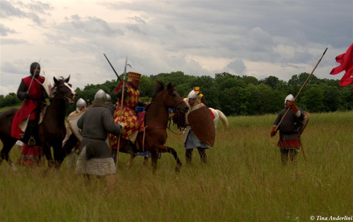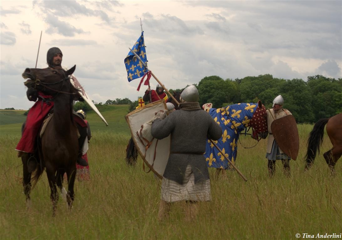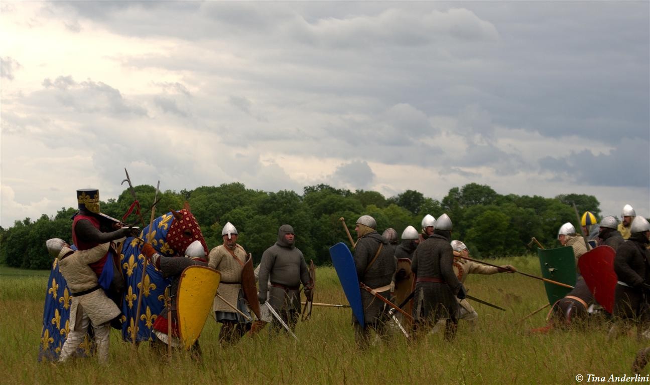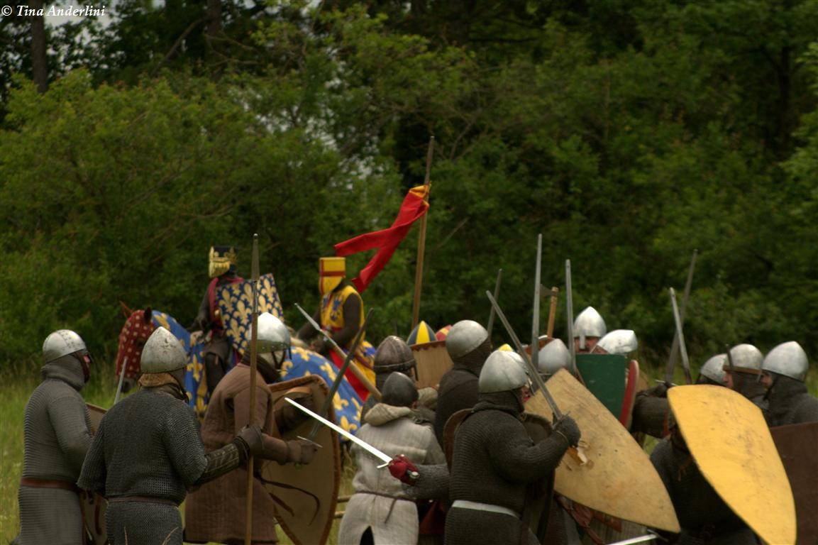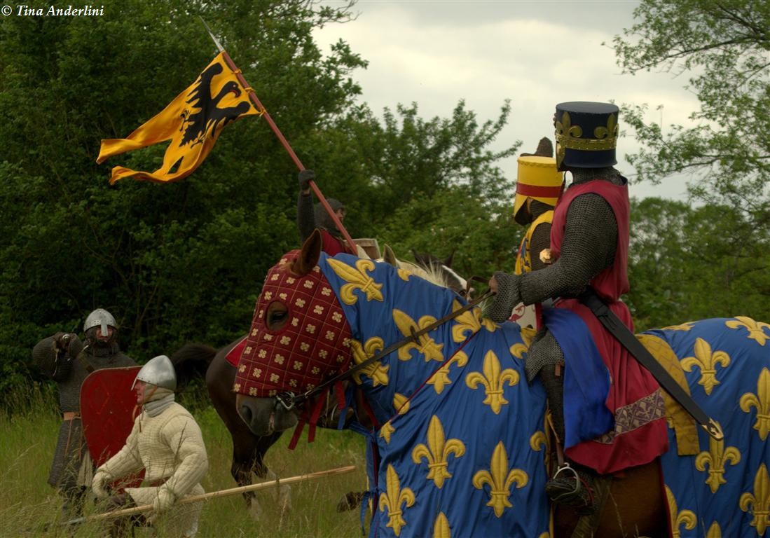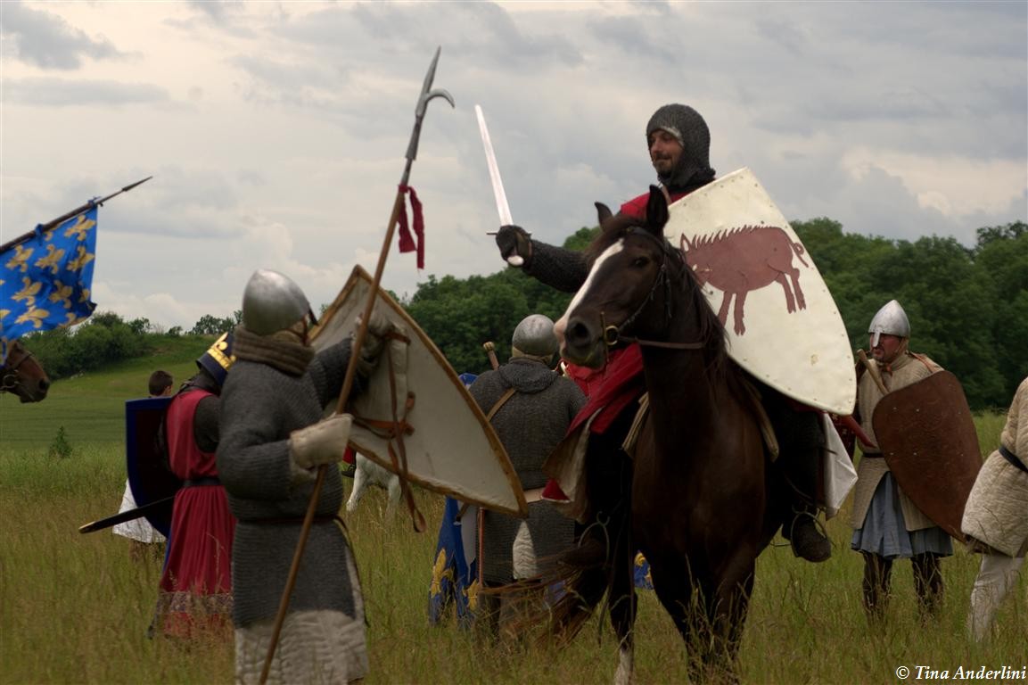 Фестиваль Битва при БувинеБитва при Бувине – сражение 27 июля 1214 года между войсками французского короля Филиппа II Августа и англо-фламандско-немецкой коалиции, возглавляемой императором Священной Римской империи Оттоном IV. Завершилась победой французов и усилением королевской Франции. Конница противников была построена отдельными колоннами. Пехота (лучники, копейщики) располагались впереди рыцарей. В задачу пехоты входило служить живым бруствером для рыцарской конницы. Так, один из отрядов армии Оттона выделил несколько сот пехотинцев, создавших своего рода круг. В ходе сражения рыцари по мере необходимости скрывались в этом «убежище» и приводили себя в порядок. Само сражение протекало в форме отдельных схваток отрядов и групп рыцарей. Никакого общего руководства не было; император и король сражались как рядовые рыцари. Битва закончилась победой французов. В бою отличился епископ-воин Филипп де Дрё. Он пользовался палицей, отказавшись от режущего оружия, как кровоточительного, – согласно каноническим законам, запрещавшим священникам проливать кровь. Цитата из описания битвы при Бувине: «Левое крыло французов долго не могло справиться с войсками Солсбери и Рено Булонского, укрывавшегося в каре своих брабансонов, но положение союзников и здесь было поколеблено атакой, которую произвел епископ Бове со своими милициями. «Страшный епископ», вооруженный палицей, лично поразил Солсбери и многих других неприятельских воинов.» Ниже на фотографиях представлена реконструкция битвы проводимая на фестивале Bouvines 1214, на том месте где 700 лет назад проходило это сражение. Это мероприятие отличает не большое количество участников, а высокий уровень достеверности в исторической реконструкции первой половины 13 века. Одежда, оружие, доспехи, снаряжение всадника и коня отличается большой аутентичностью. Бои постановочные, репетицию боев можно посмотреть на этой странице. Официальный сайт фестиваля: www.bouvines1214.org.