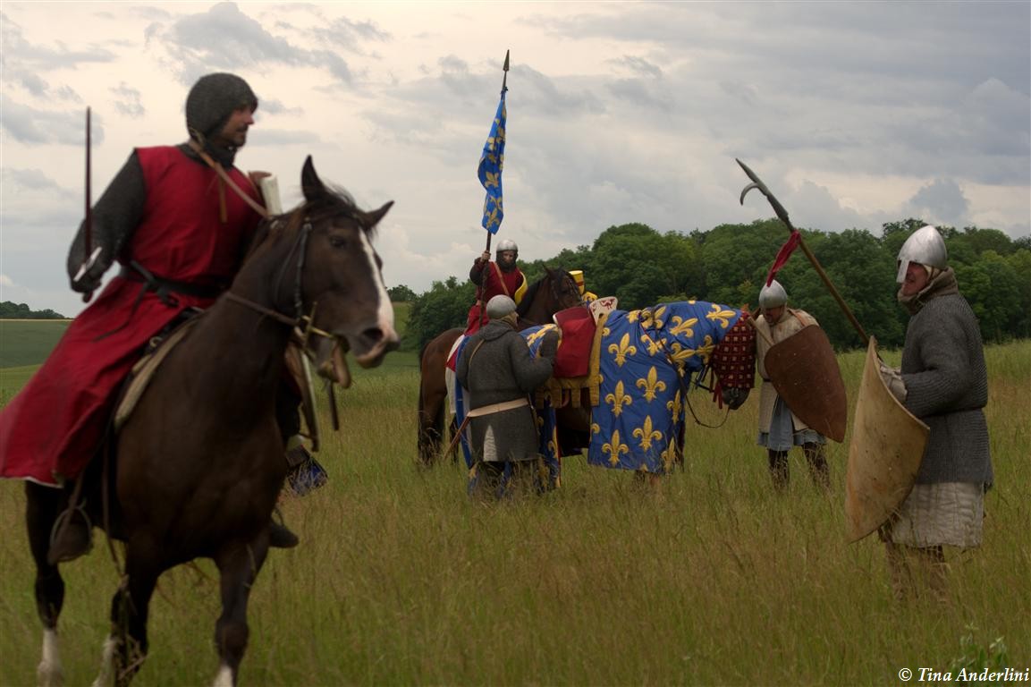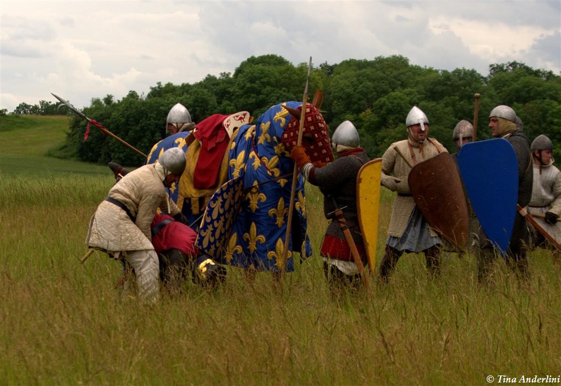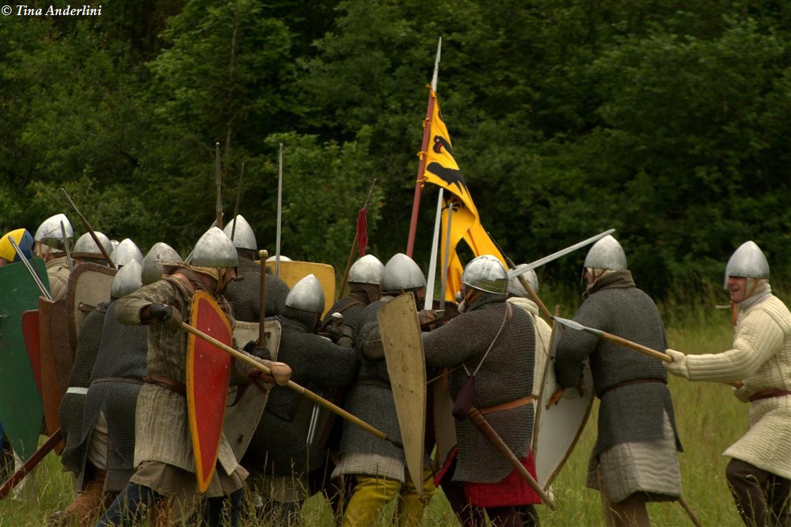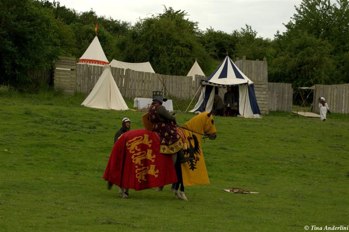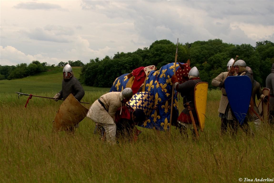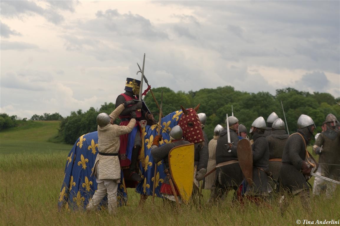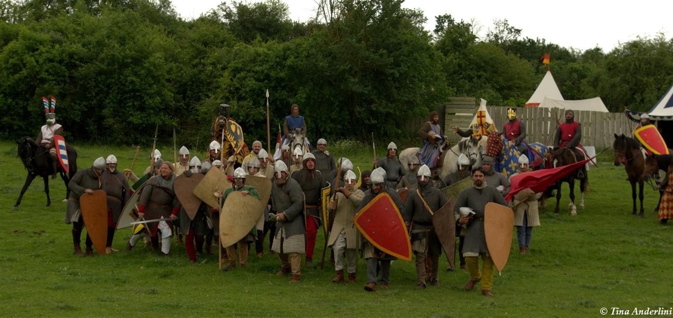 Фестиваль Битва при БувинеБитва при Бувине – сражение 27 июля 1214 года между войсками французского короля Филиппа II Августа и англо-фламандско-немецкой коалиции, возглавляемой императором Священной Римской империи Оттоном IV. Завершилась победой французов и усилением королевской Франции. Конница противников была построена отдельными колоннами. Пехота (лучники, копейщики) располагались впереди рыцарей. В задачу пехоты входило служить живым бруствером для рыцарской конницы. Так, один из отрядов армии Оттона выделил несколько сот пехотинцев, создавших своего рода круг. В ходе сражения рыцари по мере необходимости скрывались в этом «убежище» и приводили себя в порядок. Само сражение протекало в форме отдельных схваток отрядов и групп рыцарей. Никакого общего руководства не было; император и король сражались как рядовые рыцари. Битва закончилась победой французов. В бою отличился епископ-воин Филипп де Дрё. Он пользовался палицей, отказавшись от режущего оружия, как кровоточительного, – согласно каноническим законам, запрещавшим священникам проливать кровь. Цитата из описания битвы при Бувине: «Левое крыло французов долго не могло справиться с войсками Солсбери и Рено Булонского, укрывавшегося в каре своих брабансонов, но положение союзников и здесь было поколеблено атакой, которую произвел епископ Бове со своими милициями. «Страшный епископ», вооруженный палицей, лично поразил Солсбери и многих других неприятельских воинов.» Ниже на фотографиях представлена реконструкция битвы проводимая на фестивале Bouvines 1214, на том месте где 700 лет назад проходило это сражение. Это мероприятие отличает не большое количество участников, а высокий уровень достеверности в исторической реконструкции первой половины 13 века. Одежда, оружие, доспехи, снаряжение всадника и коня отличается большой аутентичностью. Бои постановочные, репетицию боев можно посмотреть на этой странице. Официальный сайт фестиваля: www.bouvines1214.org.