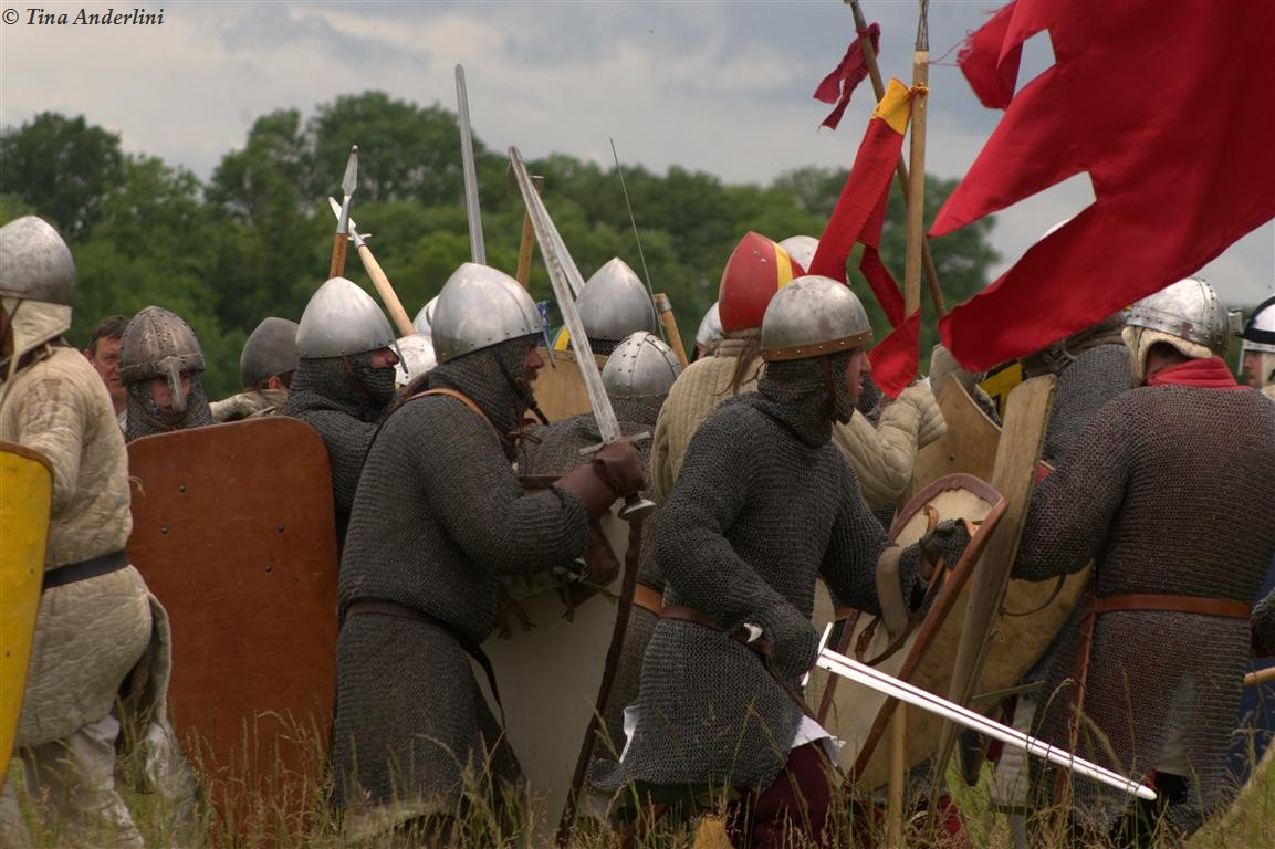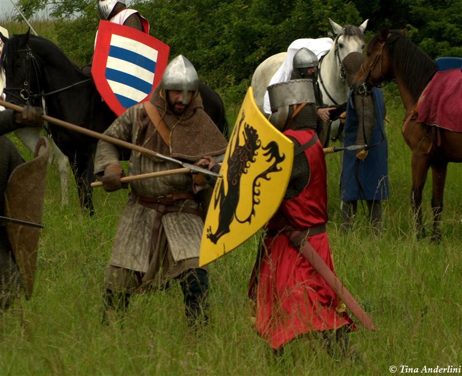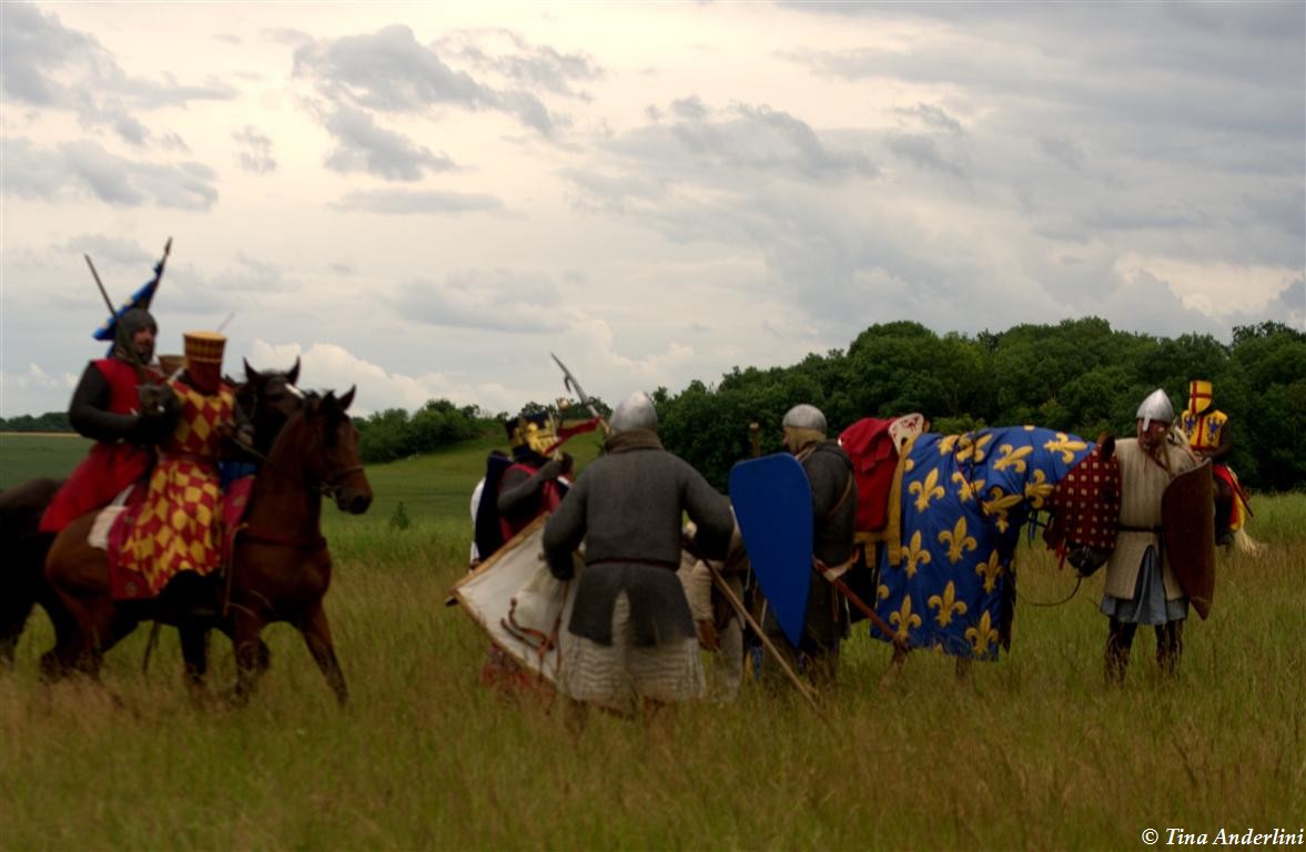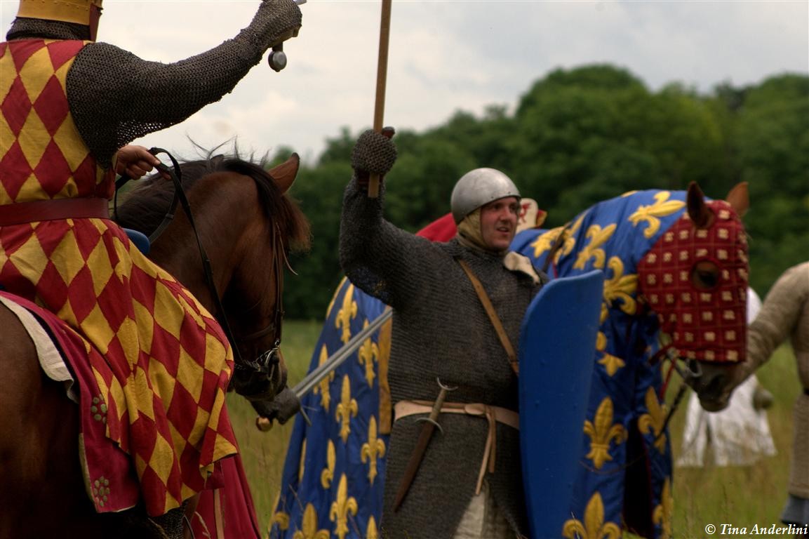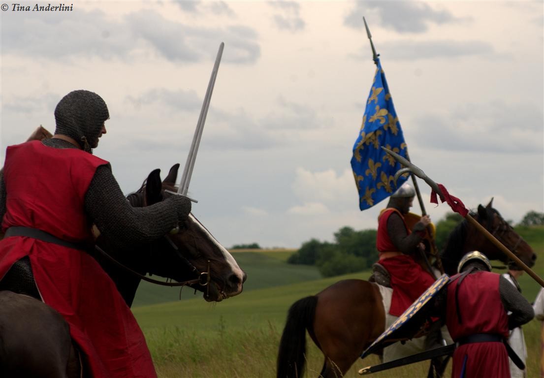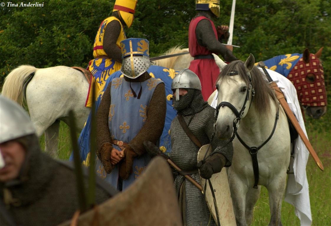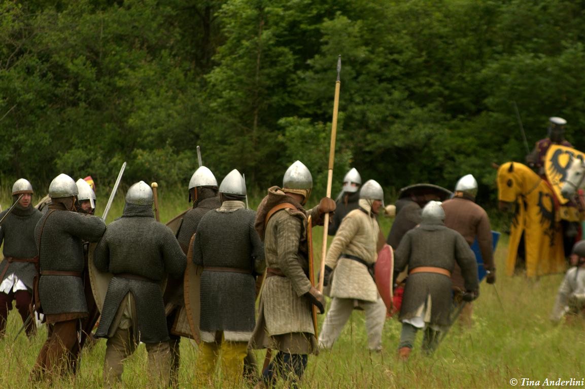 Фестиваль Битва при БувинеБитва при Бувине – сражение 27 июля 1214 года между войсками французского короля Филиппа II Августа и англо-фламандско-немецкой коалиции, возглавляемой императором Священной Римской империи Оттоном IV. Завершилась победой французов и усилением королевской Франции. Конница противников была построена отдельными колоннами. Пехота (лучники, копейщики) располагались впереди рыцарей. В задачу пехоты входило служить живым бруствером для рыцарской конницы. Так, один из отрядов армии Оттона выделил несколько сот пехотинцев, создавших своего рода круг. В ходе сражения рыцари по мере необходимости скрывались в этом «убежище» и приводили себя в порядок. Само сражение протекало в форме отдельных схваток отрядов и групп рыцарей. Никакого общего руководства не было; император и король сражались как рядовые рыцари. Битва закончилась победой французов. В бою отличился епископ-воин Филипп де Дрё. Он пользовался палицей, отказавшись от режущего оружия, как кровоточительного, – согласно каноническим законам, запрещавшим священникам проливать кровь. Цитата из описания битвы при Бувине: «Левое крыло французов долго не могло справиться с войсками Солсбери и Рено Булонского, укрывавшегося в каре своих брабансонов, но положение союзников и здесь было поколеблено атакой, которую произвел епископ Бове со своими милициями. «Страшный епископ», вооруженный палицей, лично поразил Солсбери и многих других неприятельских воинов.» Ниже на фотографиях представлена реконструкция битвы проводимая на фестивале Bouvines 1214, на том месте где 700 лет назад проходило это сражение. Это мероприятие отличает не большое количество участников, а высокий уровень достеверности в исторической реконструкции первой половины 13 века. Одежда, оружие, доспехи, снаряжение всадника и коня отличается большой аутентичностью. Бои постановочные, репетицию боев можно посмотреть на этой странице. Официальный сайт фестиваля: www.bouvines1214.org.
