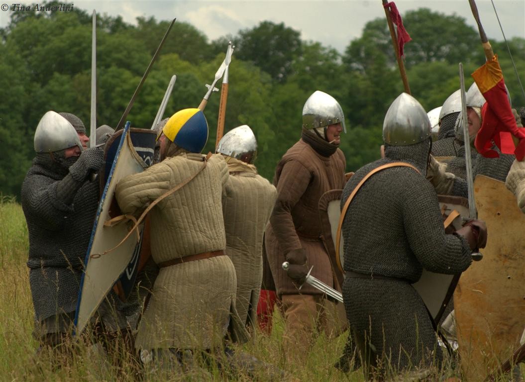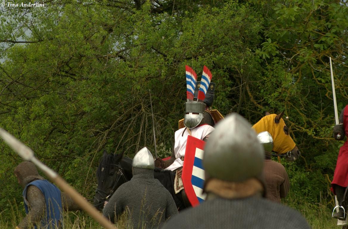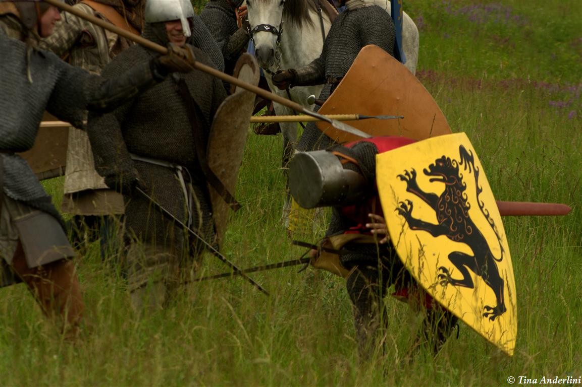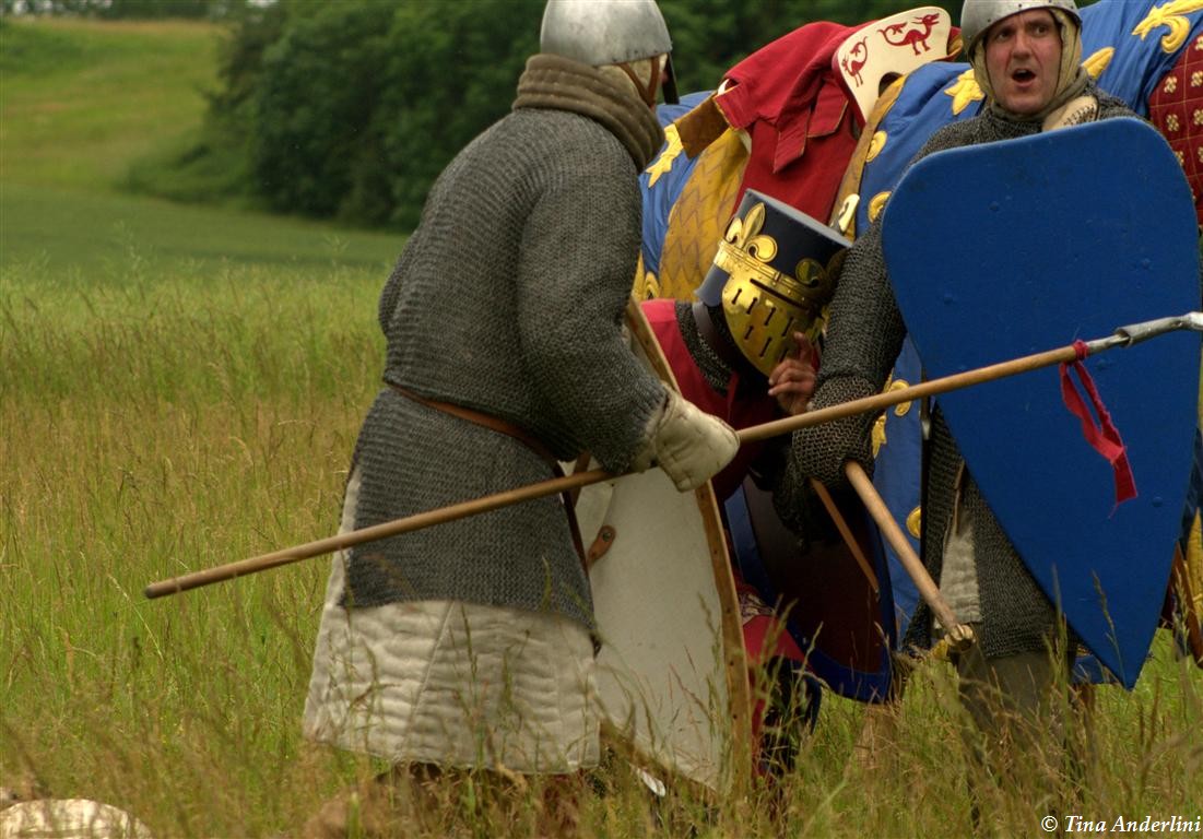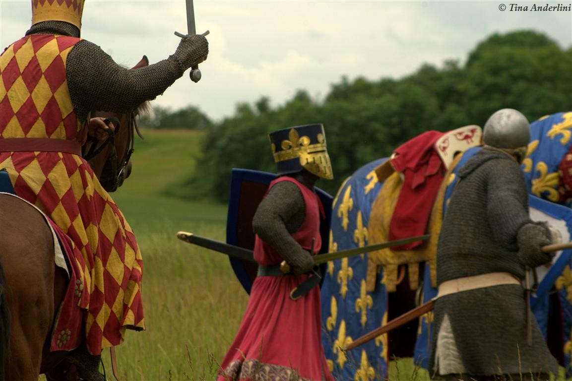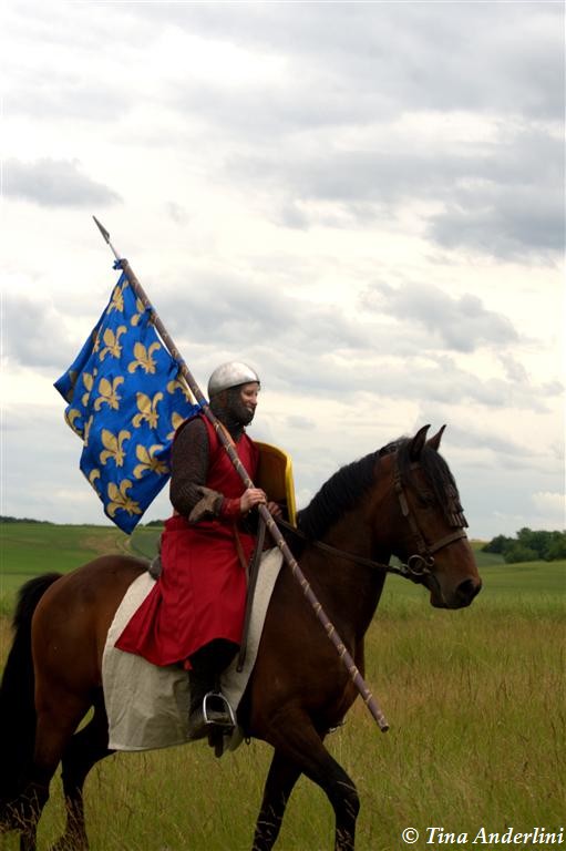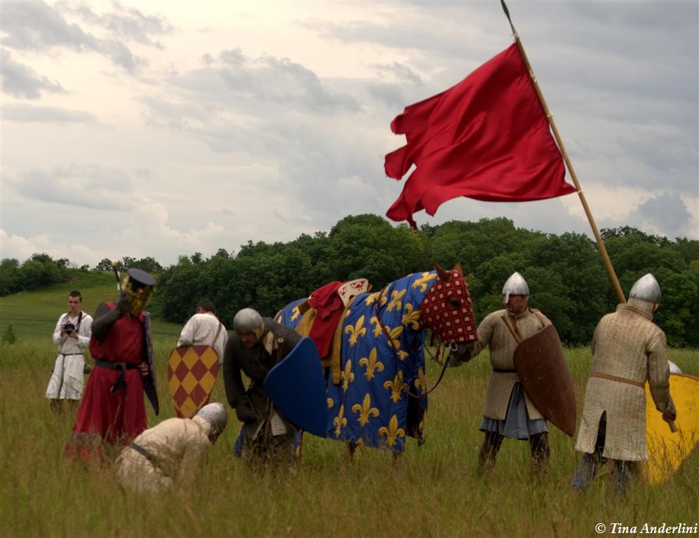 Фестиваль Битва при БувинеБитва при Бувине – сражение 27 июля 1214 года между войсками французского короля Филиппа II Августа и англо-фламандско-немецкой коалиции, возглавляемой императором Священной Римской империи Оттоном IV. Завершилась победой французов и усилением королевской Франции. Конница противников была построена отдельными колоннами. Пехота (лучники, копейщики) располагались впереди рыцарей. В задачу пехоты входило служить живым бруствером для рыцарской конницы. Так, один из отрядов армии Оттона выделил несколько сот пехотинцев, создавших своего рода круг. В ходе сражения рыцари по мере необходимости скрывались в этом «убежище» и приводили себя в порядок. Само сражение протекало в форме отдельных схваток отрядов и групп рыцарей. Никакого общего руководства не было; император и король сражались как рядовые рыцари. Битва закончилась победой французов. В бою отличился епископ-воин Филипп де Дрё. Он пользовался палицей, отказавшись от режущего оружия, как кровоточительного, – согласно каноническим законам, запрещавшим священникам проливать кровь. Цитата из описания битвы при Бувине: «Левое крыло французов долго не могло справиться с войсками Солсбери и Рено Булонского, укрывавшегося в каре своих брабансонов, но положение союзников и здесь было поколеблено атакой, которую произвел епископ Бове со своими милициями. «Страшный епископ», вооруженный палицей, лично поразил Солсбери и многих других неприятельских воинов.» Ниже на фотографиях представлена реконструкция битвы проводимая на фестивале Bouvines 1214, на том месте где 700 лет назад проходило это сражение. Это мероприятие отличает не большое количество участников, а высокий уровень достеверности в исторической реконструкции первой половины 13 века. Одежда, оружие, доспехи, снаряжение всадника и коня отличается большой аутентичностью. Бои постановочные, репетицию боев можно посмотреть на этой странице. Официальный сайт фестиваля: www.bouvines1214.org.