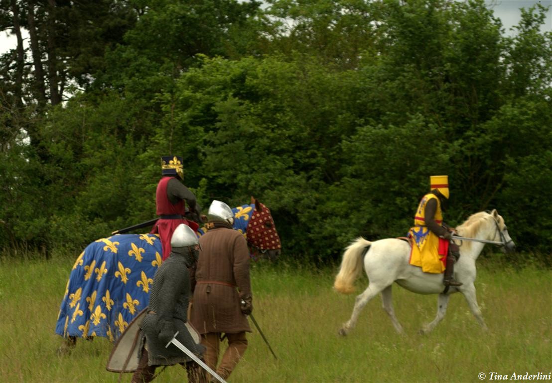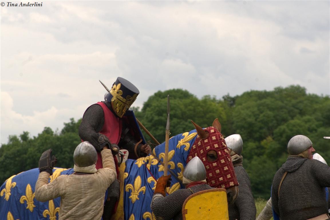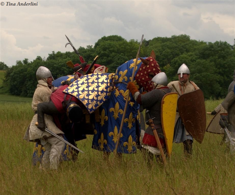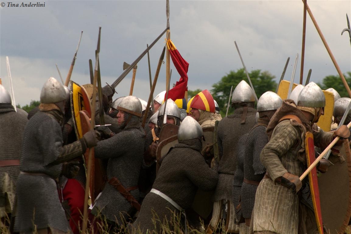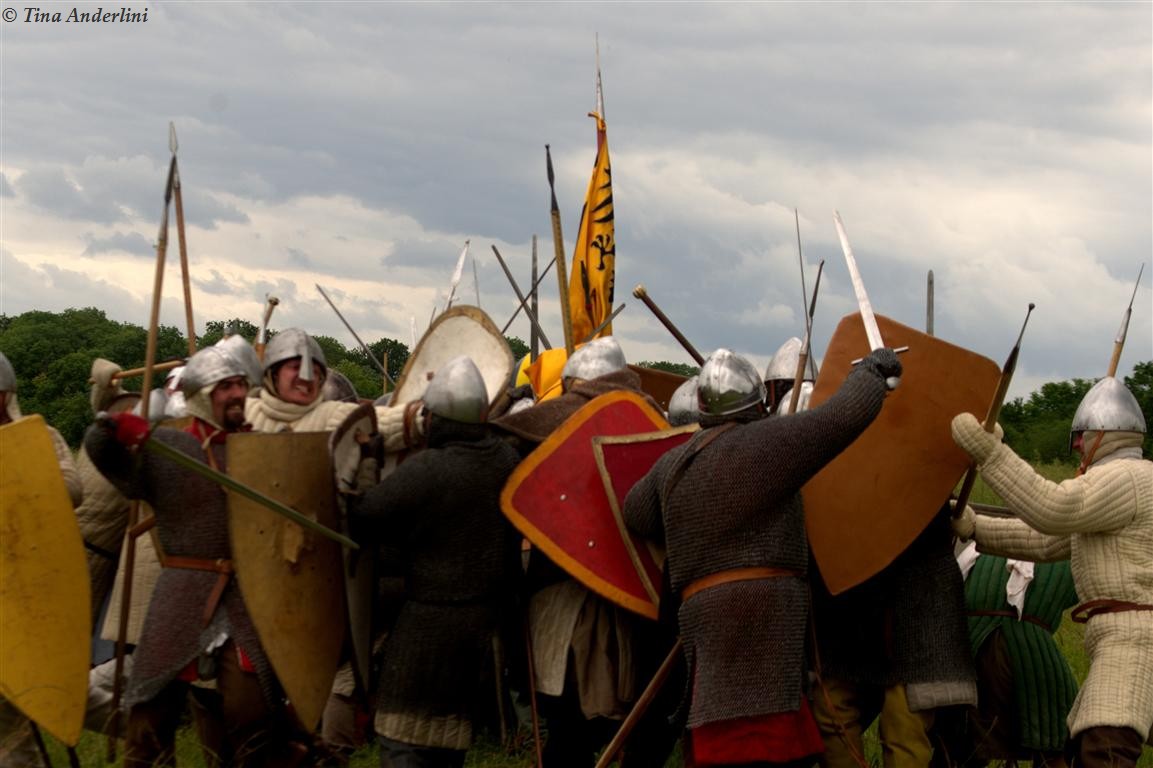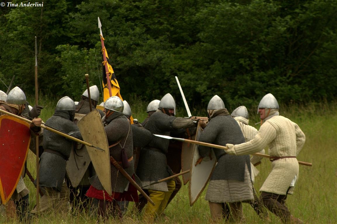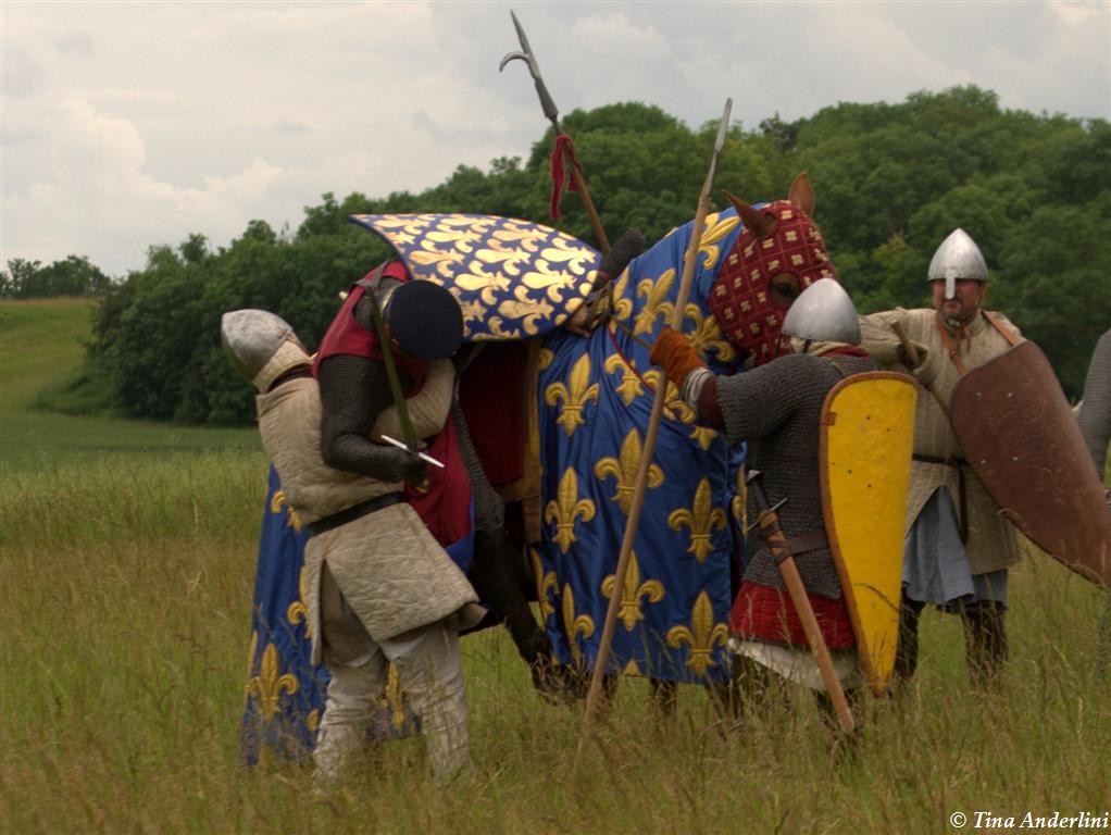 Фестиваль Битва при БувинеБитва при Бувине – сражение 27 июля 1214 года между войсками французского короля Филиппа II Августа и англо-фламандско-немецкой коалиции, возглавляемой императором Священной Римской империи Оттоном IV. Завершилась победой французов и усилением королевской Франции. Конница противников была построена отдельными колоннами. Пехота (лучники, копейщики) располагались впереди рыцарей. В задачу пехоты входило служить живым бруствером для рыцарской конницы. Так, один из отрядов армии Оттона выделил несколько сот пехотинцев, создавших своего рода круг. В ходе сражения рыцари по мере необходимости скрывались в этом «убежище» и приводили себя в порядок. Само сражение протекало в форме отдельных схваток отрядов и групп рыцарей. Никакого общего руководства не было; император и король сражались как рядовые рыцари. Битва закончилась победой французов. В бою отличился епископ-воин Филипп де Дрё. Он пользовался палицей, отказавшись от режущего оружия, как кровоточительного, – согласно каноническим законам, запрещавшим священникам проливать кровь. Цитата из описания битвы при Бувине: «Левое крыло французов долго не могло справиться с войсками Солсбери и Рено Булонского, укрывавшегося в каре своих брабансонов, но положение союзников и здесь было поколеблено атакой, которую произвел епископ Бове со своими милициями. «Страшный епископ», вооруженный палицей, лично поразил Солсбери и многих других неприятельских воинов.» Ниже на фотографиях представлена реконструкция битвы проводимая на фестивале Bouvines 1214, на том месте где 700 лет назад проходило это сражение. Это мероприятие отличает не большое количество участников, а высокий уровень достеверности в исторической реконструкции первой половины 13 века. Одежда, оружие, доспехи, снаряжение всадника и коня отличается большой аутентичностью. Бои постановочные, репетицию боев можно посмотреть на этой странице. Официальный сайт фестиваля: www.bouvines1214.org.