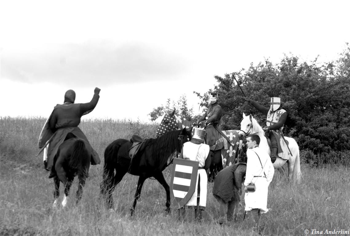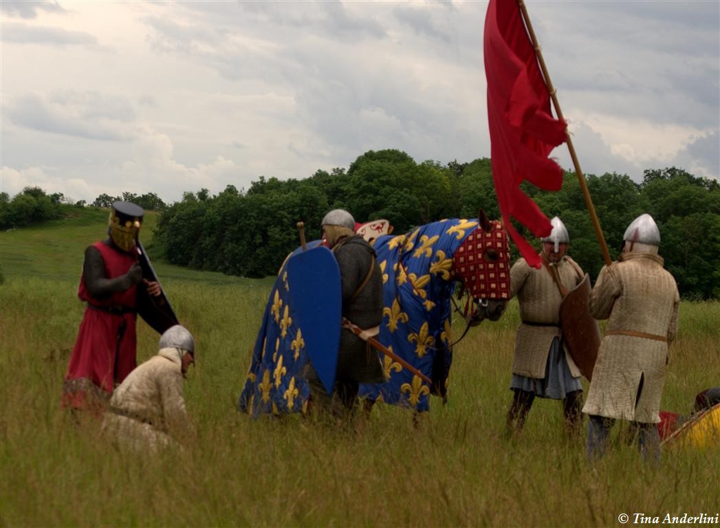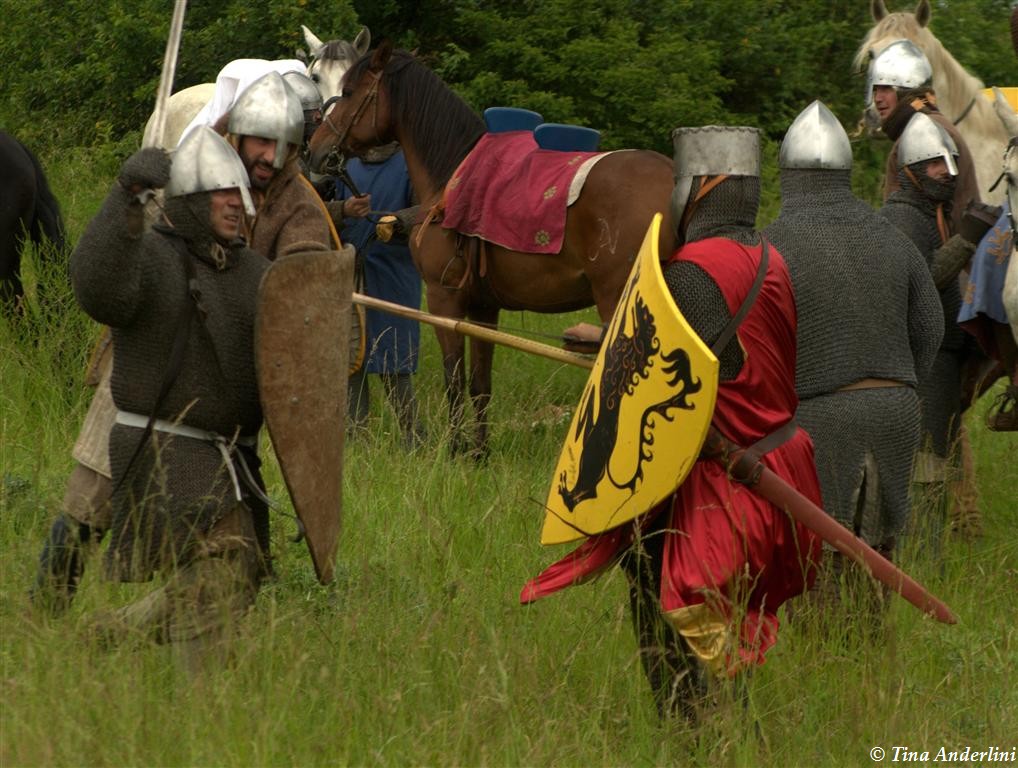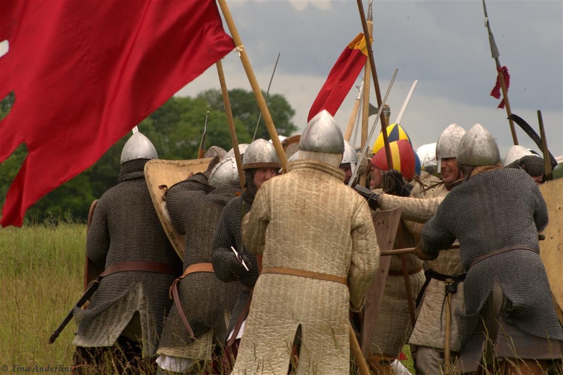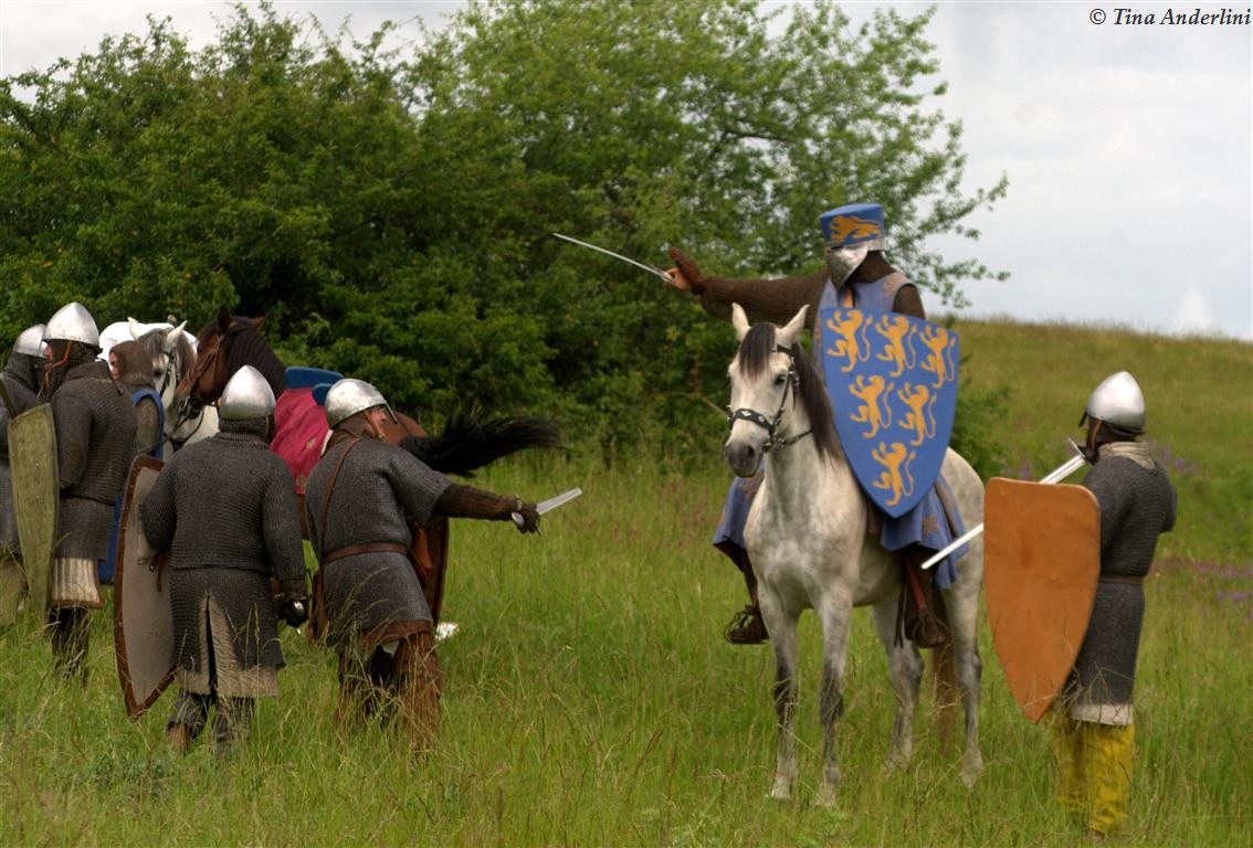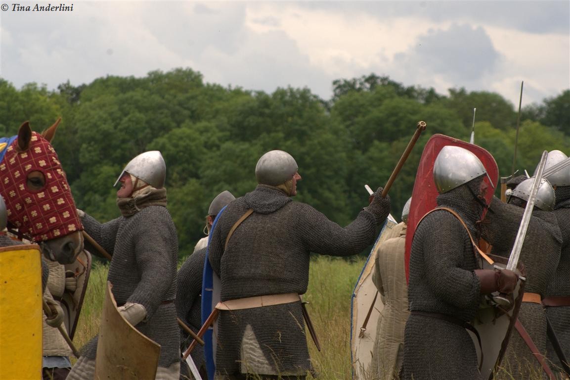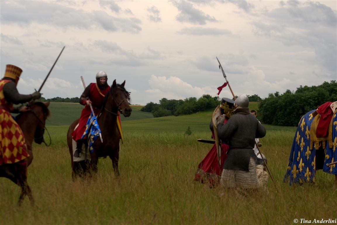 Фестиваль Битва при БувинеБитва при Бувине – сражение 27 июля 1214 года между войсками французского короля Филиппа II Августа и англо-фламандско-немецкой коалиции, возглавляемой императором Священной Римской империи Оттоном IV. Завершилась победой французов и усилением королевской Франции. Конница противников была построена отдельными колоннами. Пехота (лучники, копейщики) располагались впереди рыцарей. В задачу пехоты входило служить живым бруствером для рыцарской конницы. Так, один из отрядов армии Оттона выделил несколько сот пехотинцев, создавших своего рода круг. В ходе сражения рыцари по мере необходимости скрывались в этом «убежище» и приводили себя в порядок. Само сражение протекало в форме отдельных схваток отрядов и групп рыцарей. Никакого общего руководства не было; император и король сражались как рядовые рыцари. Битва закончилась победой французов. В бою отличился епископ-воин Филипп де Дрё. Он пользовался палицей, отказавшись от режущего оружия, как кровоточительного, – согласно каноническим законам, запрещавшим священникам проливать кровь. Цитата из описания битвы при Бувине: «Левое крыло французов долго не могло справиться с войсками Солсбери и Рено Булонского, укрывавшегося в каре своих брабансонов, но положение союзников и здесь было поколеблено атакой, которую произвел епископ Бове со своими милициями. «Страшный епископ», вооруженный палицей, лично поразил Солсбери и многих других неприятельских воинов.» Ниже на фотографиях представлена реконструкция битвы проводимая на фестивале Bouvines 1214, на том месте где 700 лет назад проходило это сражение. Это мероприятие отличает не большое количество участников, а высокий уровень достеверности в исторической реконструкции первой половины 13 века. Одежда, оружие, доспехи, снаряжение всадника и коня отличается большой аутентичностью. Бои постановочные, репетицию боев можно посмотреть на этой странице. Официальный сайт фестиваля: www.bouvines1214.org.