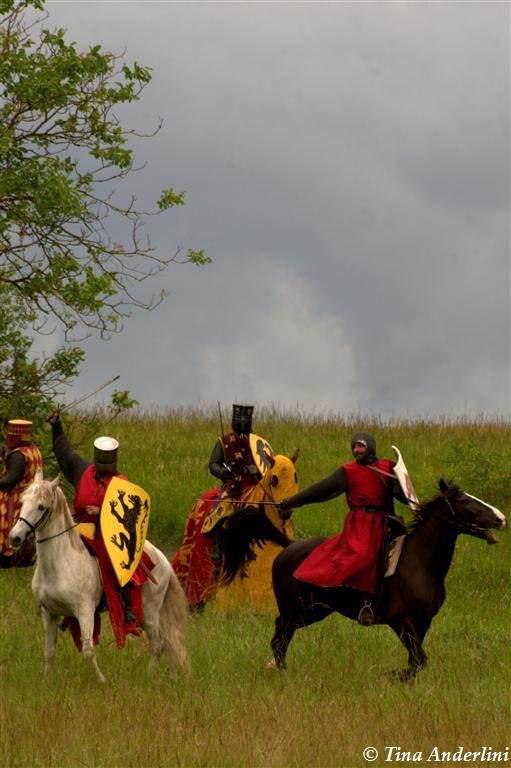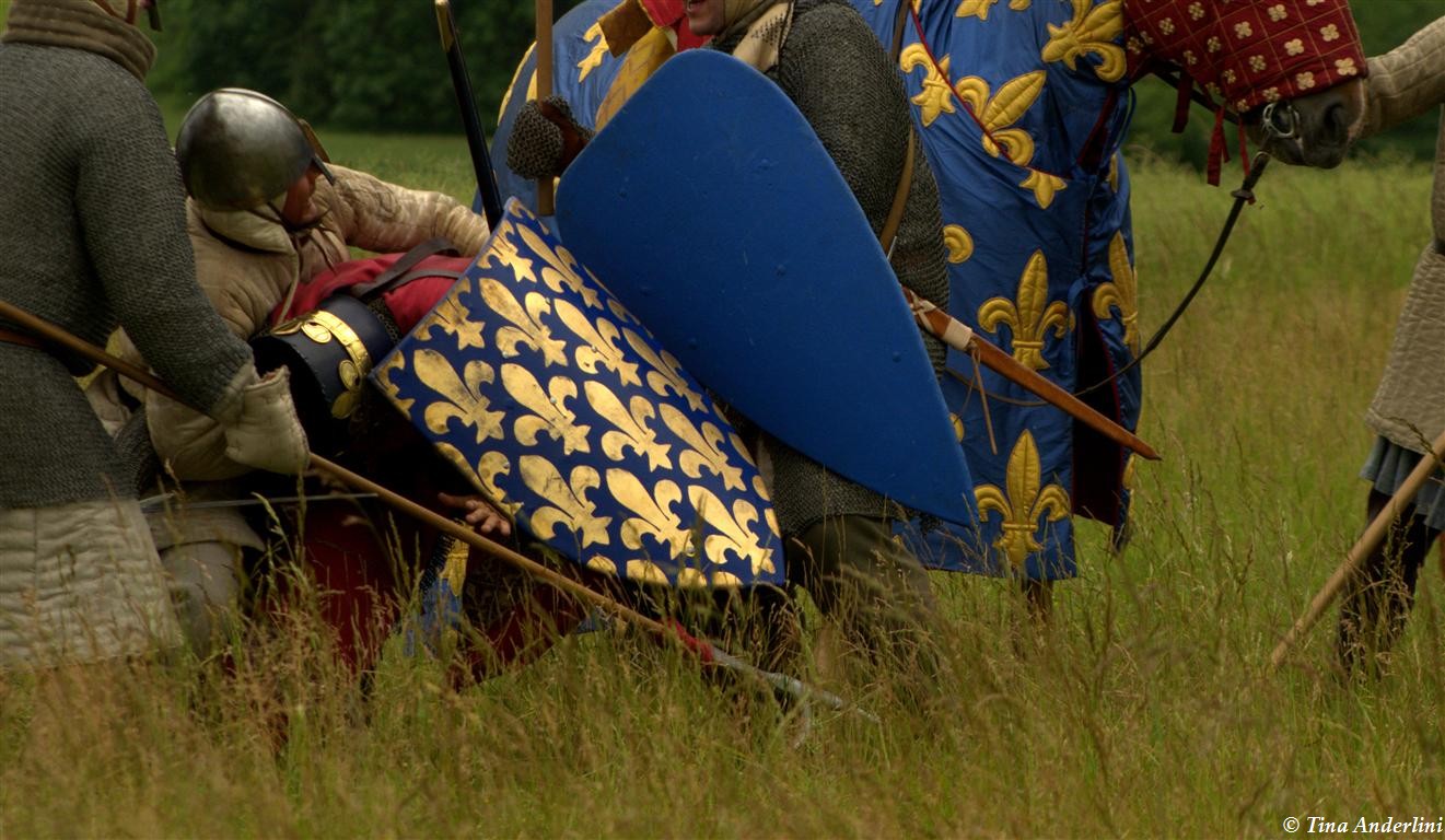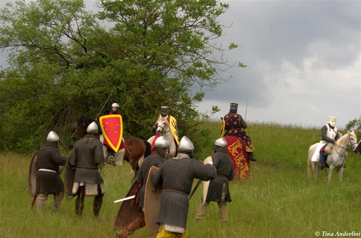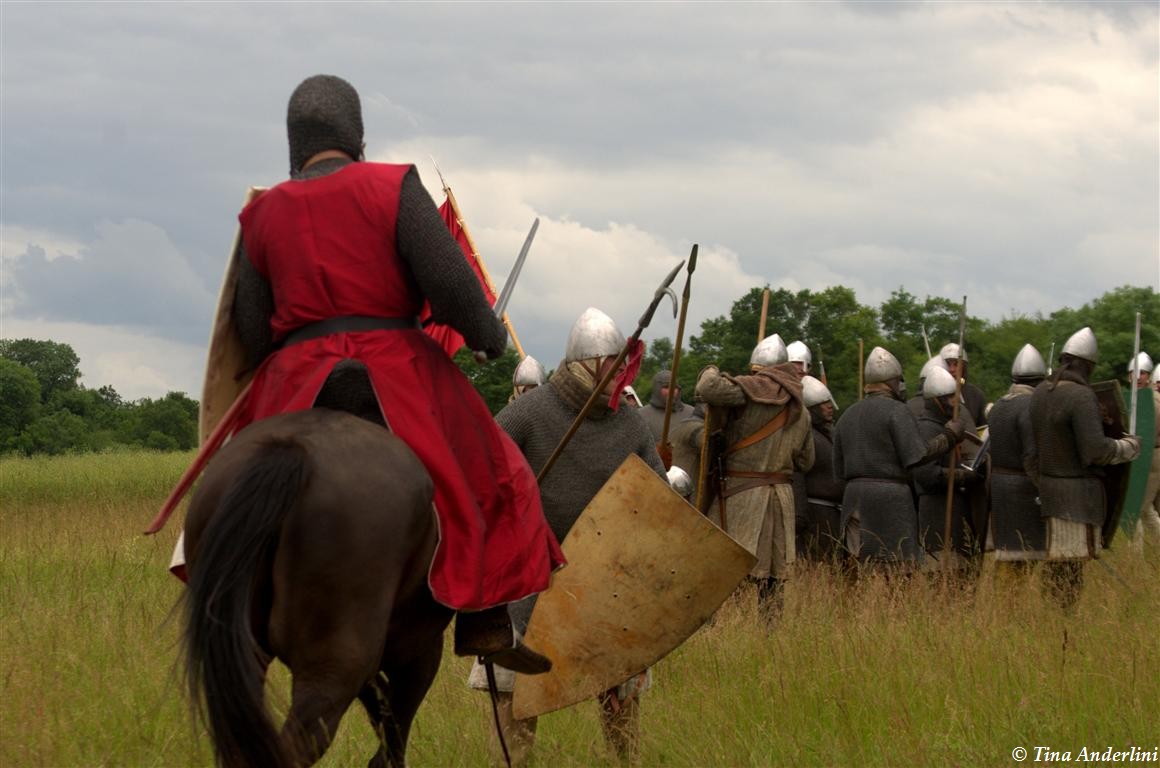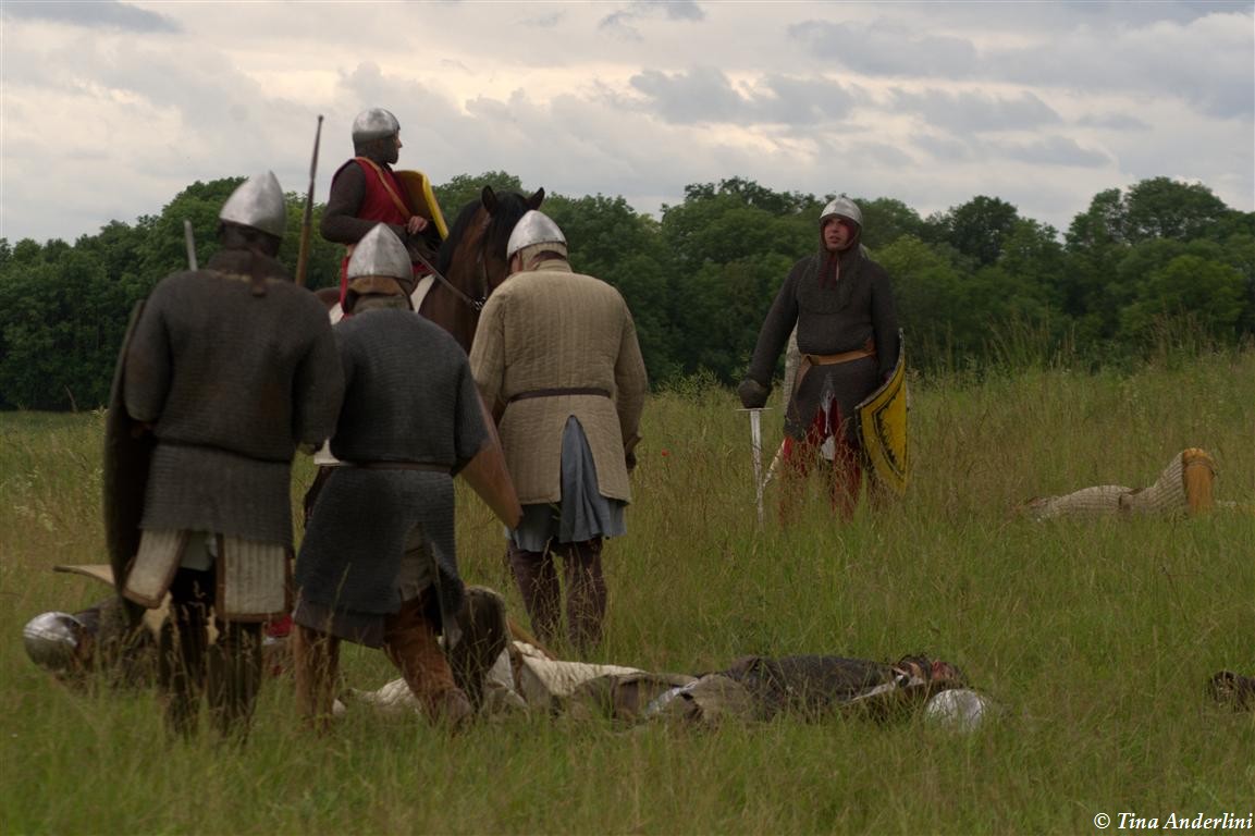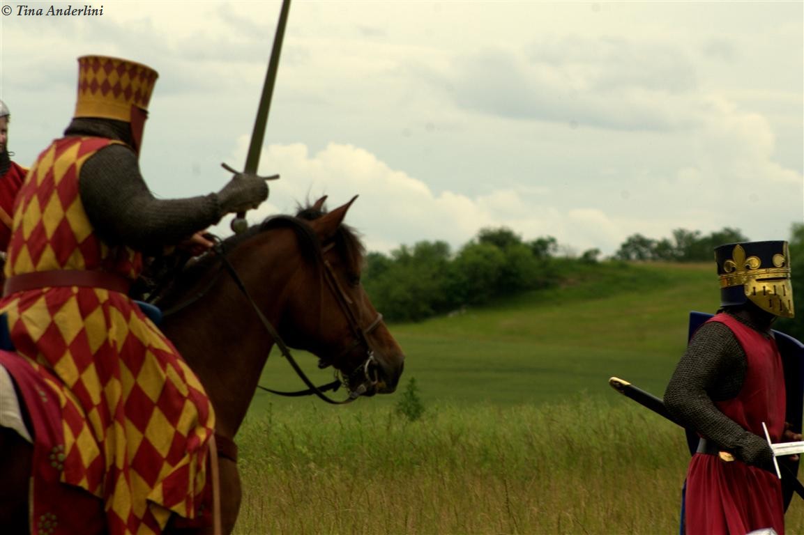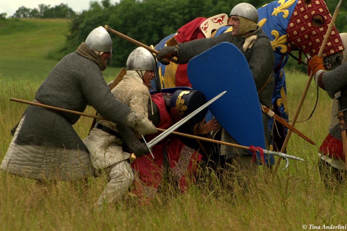 Фестиваль Битва при БувинеБитва при Бувине – сражение 27 июля 1214 года между войсками французского короля Филиппа II Августа и англо-фламандско-немецкой коалиции, возглавляемой императором Священной Римской империи Оттоном IV. Завершилась победой французов и усилением королевской Франции. Конница противников была построена отдельными колоннами. Пехота (лучники, копейщики) располагались впереди рыцарей. В задачу пехоты входило служить живым бруствером для рыцарской конницы. Так, один из отрядов армии Оттона выделил несколько сот пехотинцев, создавших своего рода круг. В ходе сражения рыцари по мере необходимости скрывались в этом «убежище» и приводили себя в порядок. Само сражение протекало в форме отдельных схваток отрядов и групп рыцарей. Никакого общего руководства не было; император и король сражались как рядовые рыцари. Битва закончилась победой французов. В бою отличился епископ-воин Филипп де Дрё. Он пользовался палицей, отказавшись от режущего оружия, как кровоточительного, – согласно каноническим законам, запрещавшим священникам проливать кровь. Цитата из описания битвы при Бувине: «Левое крыло французов долго не могло справиться с войсками Солсбери и Рено Булонского, укрывавшегося в каре своих брабансонов, но положение союзников и здесь было поколеблено атакой, которую произвел епископ Бове со своими милициями. «Страшный епископ», вооруженный палицей, лично поразил Солсбери и многих других неприятельских воинов.» Ниже на фотографиях представлена реконструкция битвы проводимая на фестивале Bouvines 1214, на том месте где 700 лет назад проходило это сражение. Это мероприятие отличает не большое количество участников, а высокий уровень достеверности в исторической реконструкции первой половины 13 века. Одежда, оружие, доспехи, снаряжение всадника и коня отличается большой аутентичностью. Бои постановочные, репетицию боев можно посмотреть на этой странице. Официальный сайт фестиваля: www.bouvines1214.org.