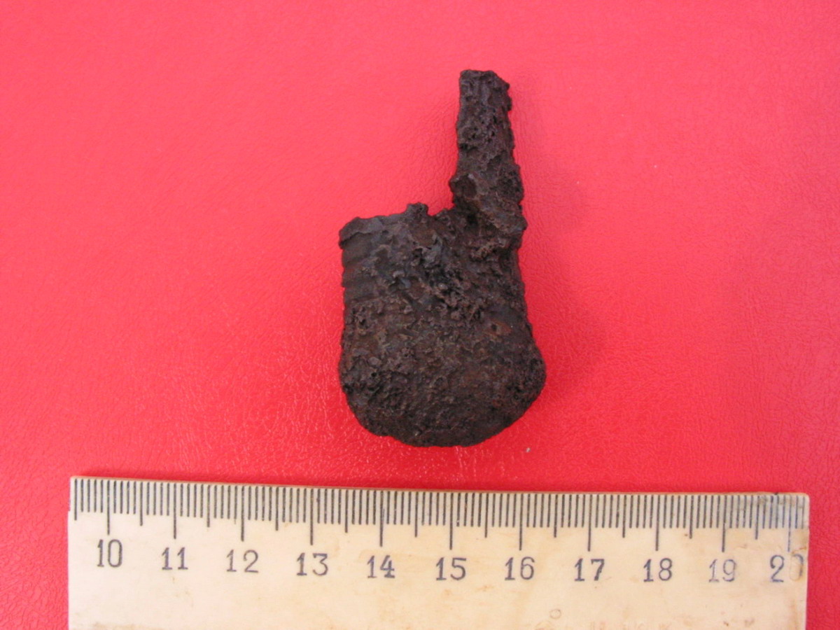 Сабля1 с прямым однолезвийным, на 13 см от конца обоюдоострым клинком с широким долом на одной из сторон (лицевой). На тыльной стороне клинка, у его окончания – выступ-елмань, у основания на лезвии – пластинчатая обойма. Общая длина сабли 71 см, черен для рукояти выделен с обеих сторон, слегка наклонен в сторону лезвия (Рис. 5: 1). Перекрестие напускное, овальное в плане, верхнее основание его прямое, нижнее в виде тупого угла, направленного вершиной к клинку, с двумя вытянутыми каплевидными выступами по сторонам. На лицевой стороне перекрестия поперечные бороздки – гнезда для инкрустации проволокой цветного металла, утраченной при кремации (Рис. 5: 1а). В могилу сабля была помещена свернутой в 1,5 оборота. Железное навершие рукояти имеет форму овальной втулки с выпуклым уплощенношаровидным завершением, на основании по обеим сторонам полукруглые выступы, соединенные стержнем, над ними с лицевой стороны – кольцо для темляка (Рис. 5: 1б). От ножен сабли сохранились железные детали: дуговидно изогнутая портупейная скоба (Рис. 5: 1в) и наконечник ножен в виде овальной втулки с выпуклым уплощенно шаровидным завершением. Лицевая сторона наконечника покрыта поперечными бороздками, служившими, как и на перекрестии, гнездами для инкрустации проволокой цветного металла (Рис. 5: 1г).