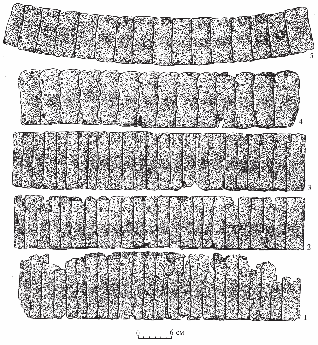 4 ряд (рис. 2.-4) состоит из 14 пластин овальнопрямоугольной формы с одной волнистовырезной стороной. Один бок пластины имеет две выемки с приостренным или слегка скругленным гребнем, похожим на волну. Их длина 9,7-9,86 см, ширина 4,11-4,7 см. Десять пластин снабжены 13 отверстиями (рис. 7-1, 3): четыре пары боковых, три срединных и пара окантовочных (нижняя). Одна пластина имеет 15 отверстий (рис. 7.-2). Ее отличие состоит в дополнительном отверстии по центру ровной стороны и одном отверстии для починки напротив боковой пары. Еще три пластины снабжены 14 отверстиями, за счет одного дополнительного напротив поврежденных боковых пар. Такие отверстия служили для скрепления пластин в полосе после поломки основных (рис. 2.-4). Общая длина четвертого ряда в собранном виде 49,4 см, ширина – 10 см. Максимальная ширина нижнего канта 13,5 мм, верхнего и бокового – 10 мм.