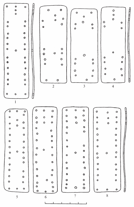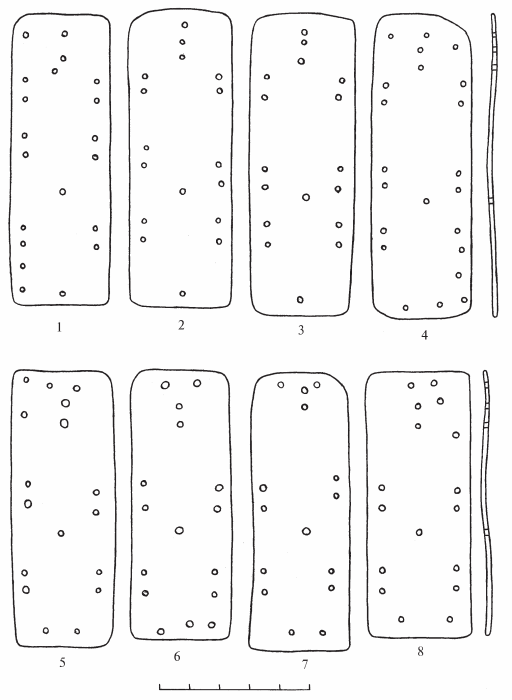 2 ряд (рис. 1 .-2) состоит из 21 пластины прямоугольной формы. Их длина 7,92-8,35 см, ширина 3,1-3,47 см. Четыре пластины имеют по 15 отверстий (рис. 3.-5): четыре пары боковых, три срединных и две пары окантовочных. Восемь пластин снабжены 14 отверстиями (рис. 3.-6): четыре пары боковых, три срединных и три окантовочных (пара верхних и одно нижнее). Одна пластина с 21 отверстием (рис. 3.-7): семь пар боковых, три срединных и четыре окантовочных (одно верхнее и три нижних). Еще восемь пластин с 20 отверстиями (рис. 3.-8): шесть пар боковых, три срединных и пять окантовочных (пара верхних и три нижних). Общая длина второго ряда в собранном виде 52,4 см, ширина - 8,5 см. Максимальная ширина верхнего канта 9 мм, нижнего и бокового - 8 мм.
