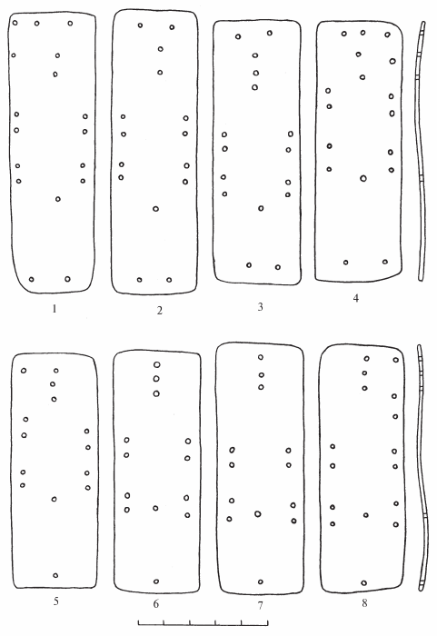 5 ряд (рис. 2.-5) состоит из 16 пластин прямоугольной формы. Их длина 7,7-8,4 см, ширина 3,26-4,4 см. 15 пластин снабжены 16 отверстиями (рис. 7.-5, 6): четыре пары боковых, две пары срединных (верхняя и центральная) и две пары окантовочных. Одна пластина имеет 12 отверстий (рис. 7.-4): четыре пары боковых, три срединных и одно окантовочное (нижнее). У двух пластин верхние углы были скруглены, что приближает их по форме к овальнопрямоугольным (рис. 7.-5). Общая длина пятого ряда в собранном виде 54,7 см, ширина –8,5 см. Максимальная ширина верхнего и нижнего канта 12,5 мм, бокового – 8 мм.
