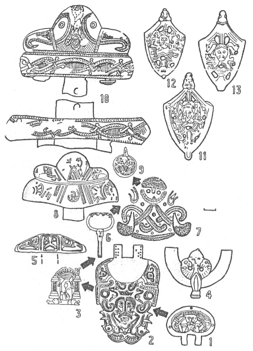 Время создания англо-саксонскими мастерами "шкатулки" из Нортумберленда — начало VШ в. — знаменует конец общегерманского язычества. Под ударами христианства — единой религии первых "варварских" королевств — язычество на Западе европейского материка было сокрушено. К этоцу времени канон Одина нашел отражение в декоре оружия франков. Навершия мечей несли изображение божества, к которому головки воронов были обращены тыльными сторонами (вариант I), наконечники ножен мечей сопровождались фигуркой Одина с прижатыми к ушам клювами птиц (вариант 2) /рис. I, 5, 4/. Существование канона в двух вариантах связано прежде всего с общими очертаниями конкретных предметов сугубо функционального назначения (навершие и наконечник), на которых помещались изображения. Оба этих варианта представлены и в декоративном искусстве Скандинавии вендельской эпохи и времени викингов (рис. I, 6, 7, 6). Как мы видим на примере декора круглой фибулы из Мортен (о. Готланд) /14, табл. 85/ в позднем IX в. Один стал изображаться обнимающим воронов за шеи. Эта характерная особенность канонического варианта 2 отображена не только на круглых подвесках севера и востока Европы /6, с. 13в/, но и на наконечниках ножен мечей X в. Количество их крайне невелико (рис. I, II—13). Эти предметы не вычленялись из остального массива наконечников, изготовленных в стиле Борре. Рисунок трактовался как изображение маски человека в обрамлении орнамента /15, с. 267; 16, с. 243; 17, рис. 339/. На самом деле при детальном рассмотрении данных трех наконечников оказывается, что на них, как и на круглых подвесках, показано поясное изображение усатого цужчины, обнимающего за шеи двух хищных птиц, клювы которых подняты над его ушами. По средней горизонтальной оси наконечников четко видны руки мужчины, изображенные тремя полосками. На наконечнике из "Игоревой могилы" детализированы даже пальцы его левой руки (рис. I, II). Торс мужчины обозначен, как и на подвесках, двумя вертикальными полосами, составленными из коротких горизонтальных отрезков. Совпадение даже в мельчайших деталях изображений на круглых подвесках и наконечниках ножен позволяет с уверенностью утверждать, что как на первых, так и на вторых предметах представлен Один (вариант 2 канона).