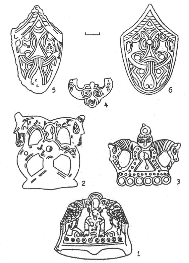 Исходя из этого положения, не вызывает удивления факт использования в финно-угорской среде на цепедержателях конструктивных принципов композиции "Один и вороны", уже осуществленной на кресалах (рис. 2, 1). Парные изображения животных на этих изделиях в принципе восходят еще ко времени контактов ананьинской и сарматской культур. Правда, воронов здесь заменили в соответствии, видимо, с местными культовыми традициями, кони (рис. 2, 3). Существенно, что контаминация изображений осуществлялась и между огнивами II группы (по Л.А. Голубевой) и цепедержателями с конскими головами IX в. /20, рис. 2, 4/. Такое использование одних и тех же композиций связано, видимо, с изготовлением украшений для населения Прикамья мастерами Волжской Булгарии. /21, с. 44/. Поступление в Скандинавию единичных украшений финно-угорского происхождения вызвало обратный эффект. Там появляются местные подражания цепедержателям с человеческой фигуркой между конями. /22, с. 160/. Это показывает, что скандинавам был близок сюжет "божество и пара животных”, который они воспринимали как родственный канону "Один и вороны".