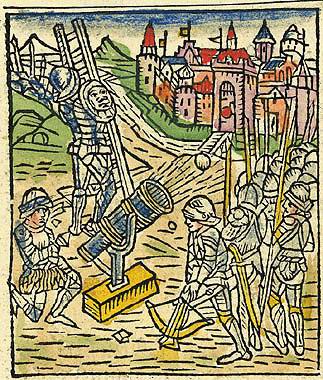 На рисунке 15-го века из хроник Фруассара (BNF FR 2645), хранящих в Национальной библиотеке Франции, изображающем битву при Оттенбурге между англичанами и шотландцами ( 1388 г .), изображено множество бойцов в доспехах, которые используют овальные баклеры и короткие мечи. |