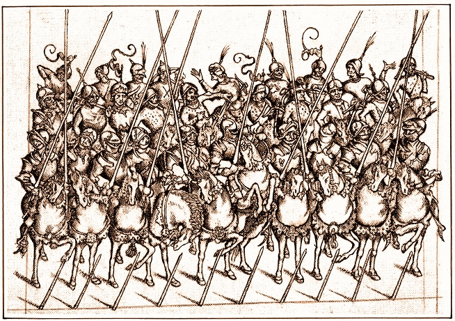 Используя аналогию с сохранившимся описанием тренировки фламандских пикинеров, проведенной 30 января 1488 г. на рыночной площади Брюгге, можно предположить, что бургундские пехотные офицеры в армии Карла Смелого отдавали следующие команды: