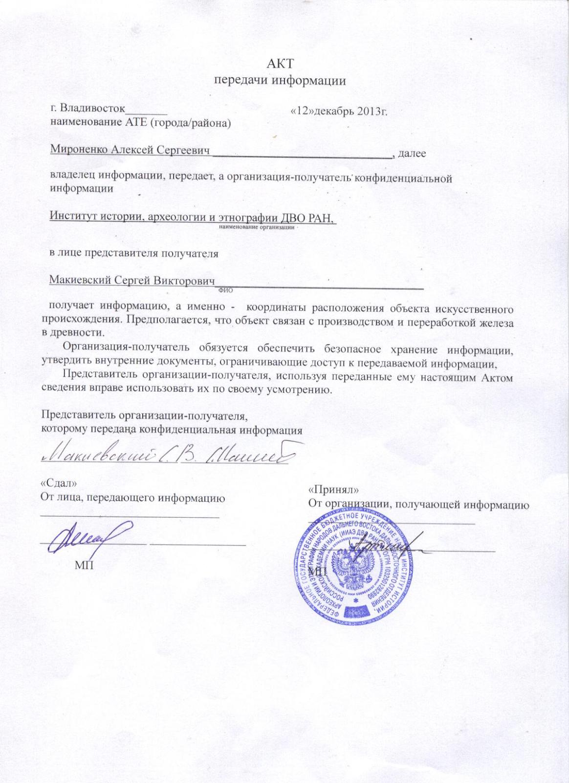 Акт передачи археологического объектаАкт передачи археологического объекта Объект в момент передачиОбъект в момент передачи Официальная благодарностьОфициальная благодарность