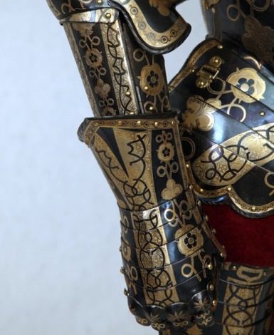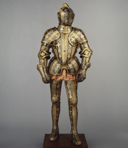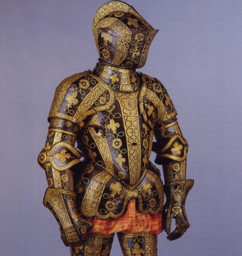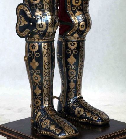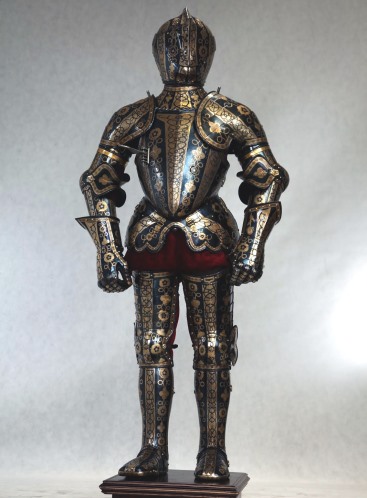 Все 48 деталей брони богато украшены. Поверхность стали когда-то вороненая в голубоватый оттенок, стала теперь почти коричневой. Также поверхность доспеха была богато ташуирована золотом, которое прекрасно сохранилось. Орнаменты: флер-де-Лис, чересстрочный ремень, и Роза Тюдоров.