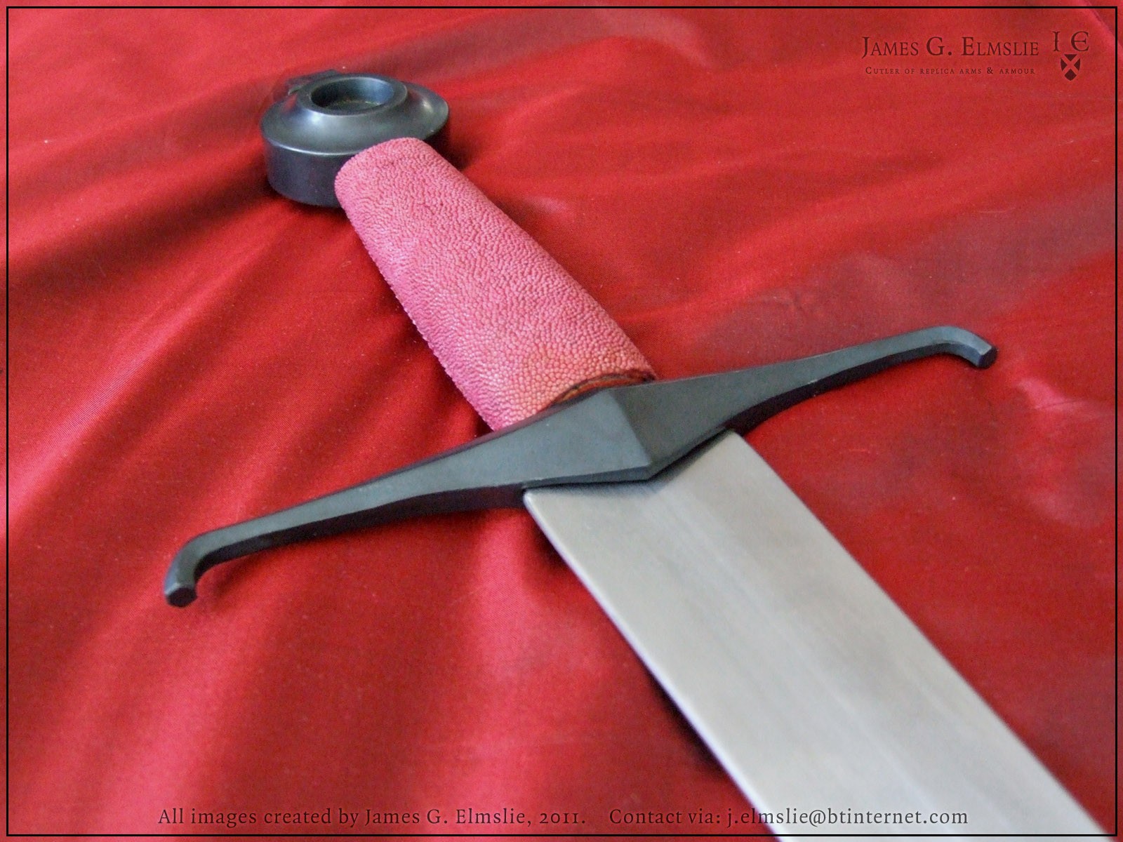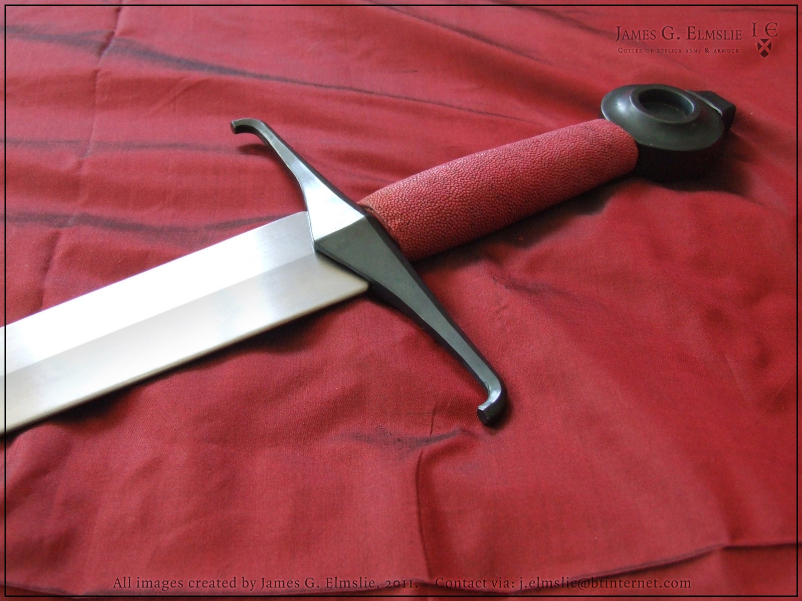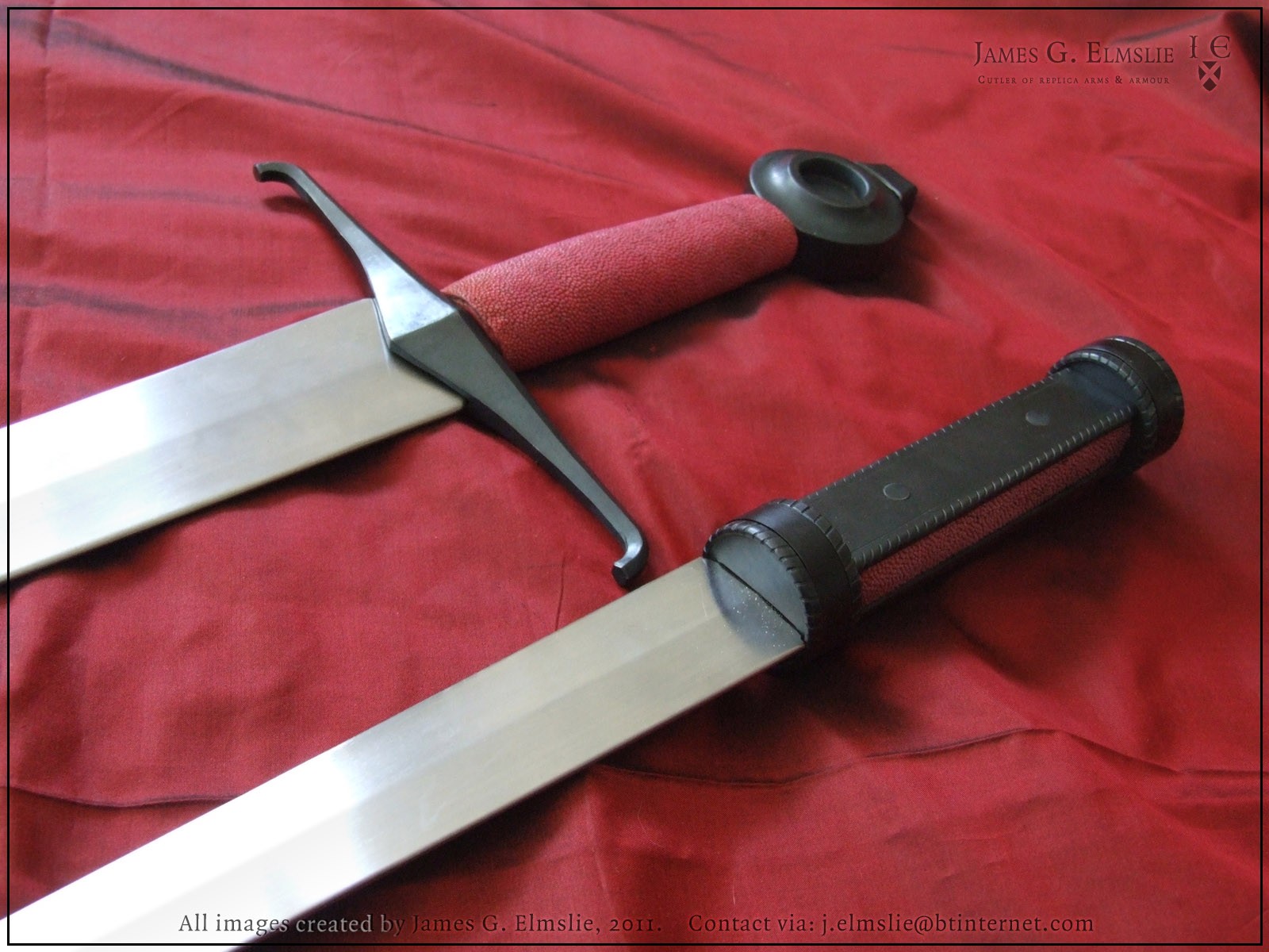 Меч конца 14 века и рондельный кинжал того же периода. Крестовина меча и диски кинжала из вороненной стали, рукояти деревянные покрыты красной шагреневой кожей. Комплект был изготовлен для участника Battle of the Nations 2014