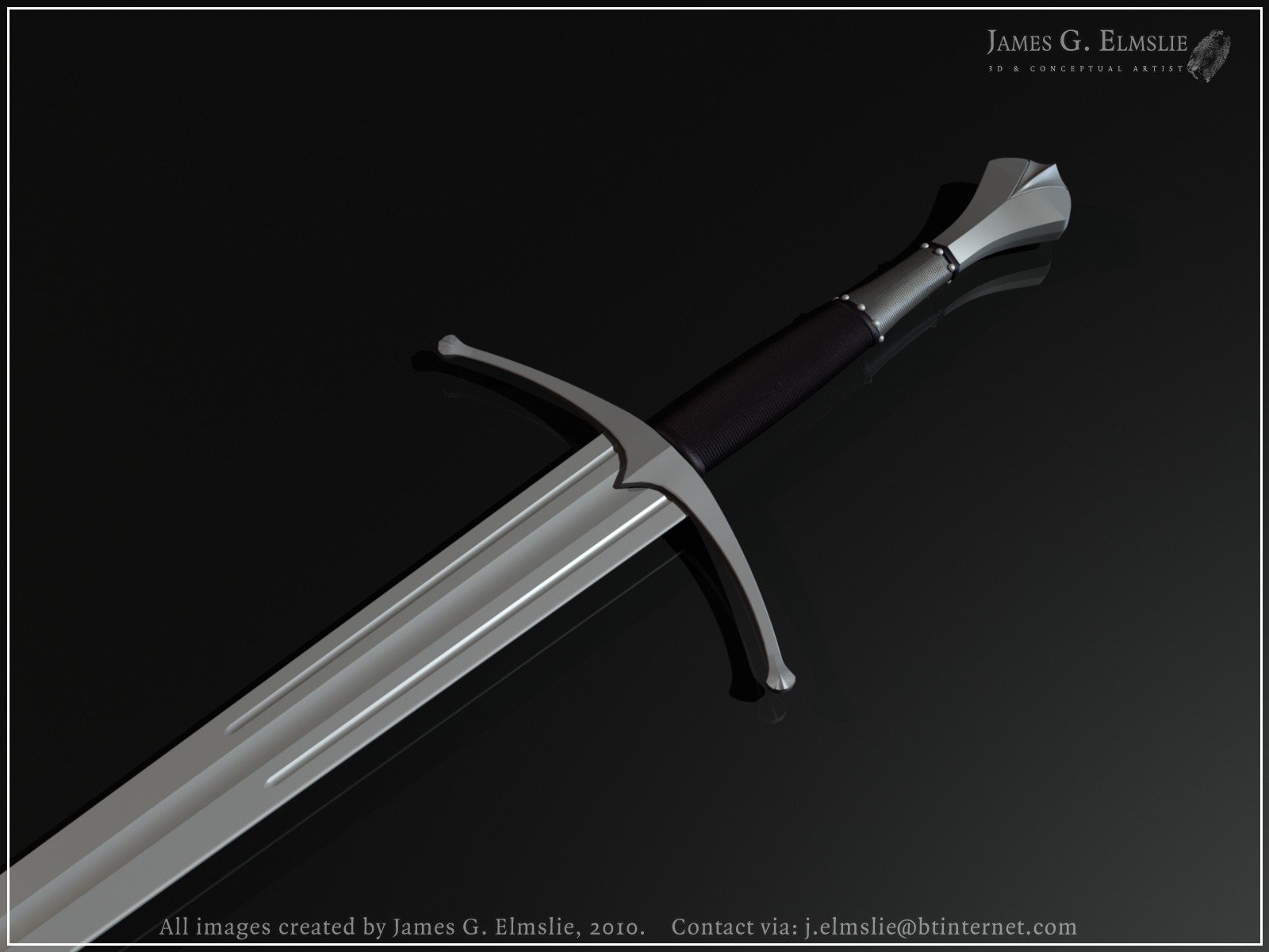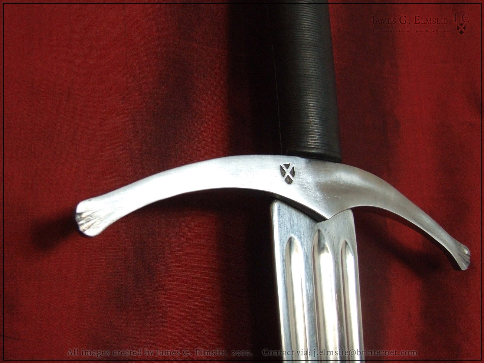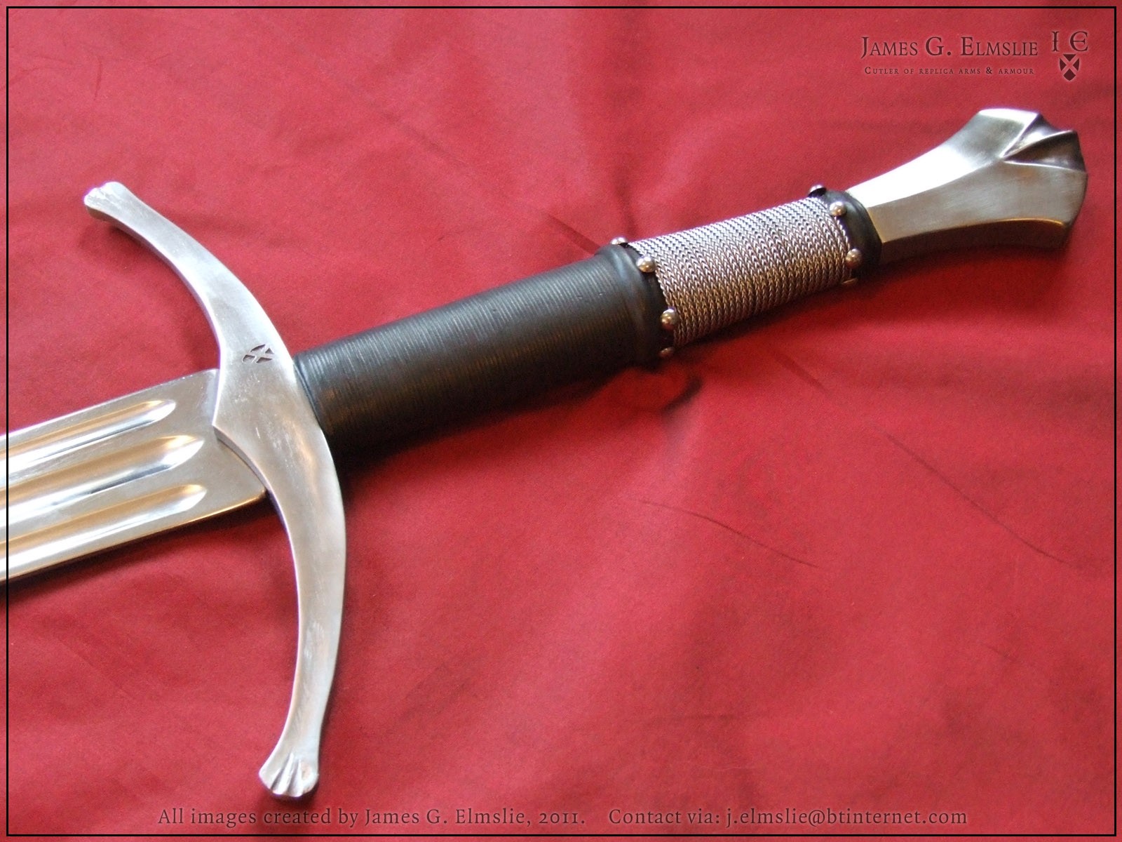 Крестовина и навершие рукояти из термически обработанной средне-углеродистой стали. На хвостовик меча вставлена рукоять из ясеня и обернута черной кожей. Рукоять наполовину обмотана сначала по часовой стрелке, затем против часовой стрелке по спирали стальной проволокой.