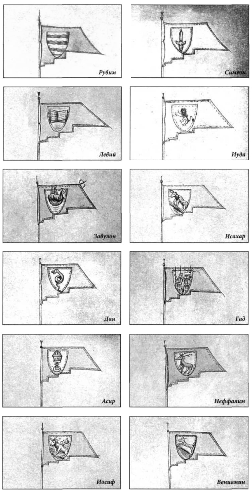В то же время православный характер большинства символических изображений на знаменах XVII в. апеллирует к истории православной духовной культуры, идеологии и искусства. Автор упомянутого трактата, демонстрируя знание мнений «древних историян» о происхождении гербов и знамен от героев античной мифологии, отметает подобные взгляды «неверных писцов», обращаясь к библейским истокам. Он ведет происхождение гербов и знамен «по совершеннейшей правде» от пророка Моисея, который, разделив двенадцать колен Израилевых на полки, наделил на основании еще более древних благословений родоначальника народа израильского патриарха Иакова их знаками и знаменами4. Опираясь на библейскую традицию, автор трактата изобразил знаки, данные Моисеем двенадцати коленам израилевым на их боевые знамена: воды (Рувим), меча (Симеон), книги (Левий), льва (Иуда), корабля (Завулон), осла (Исахар), змеи (Дан), воинов (Гад), кубка (Асир), серны (Неффалим), коровы под сенью дерева (Иосиф) и волка (Вениамин). В иудаистской традиции этим знаменам двенадцати колен израилевых приписывались и соответствующие каждому знамени цвета5.