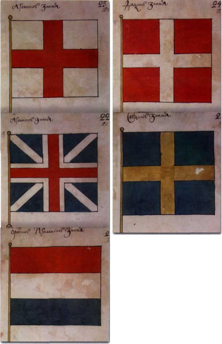 Все прочие государства, начиная с Макковейского царства и до римлян, согласно трактату, переняли употребление знаков и знамен от древних иудеев. Русский автор XVII в. доводит свою историю происхождения знаков и знамен до появления на знамене, гербе и печати у «цысарян» двуглавого орла, которого они обрели, трижды разбив римлян и захватив в качестве трофеев два римских знамени - «си-речь два орла»6. Освещая и трактуя символику геральдических цветов (золото (желтый), серебро (белый), черный, синий, красный, зеленый, вишневый, красновишневый и горностай), автор иллюстрирует свои слова и свой труд единственными в трактате цветными государственными знаменами современных ему государств северной Европы: английским, голландским, шведским и датским. Проведя своих читателей по страницам античной и библейской истории, трактат завершается величественной картиной сошествия во ад и победы над дьяволом Иисуса Христа, «имый в руку свою божественную хоруговь, еже есть честный крест». Все же прочие «хоругви», употреблявшиеся до Иисуса Христа, по мысли автора, есть «от Бога издревле учиненные знаки» о грядущем Воскресении и победе Христа над дьяволом. Автор явно проводит мысль, что все гербы и знамена являются предтечами знамению креста, подобно тому, как Ветхий Завет предшествовал Евангельским заповедям. При этом автор находит оригинальное визуальное подтверждение в виде соответствующих европейской моде простых и лаконичных североевропейских знамен с изображениями креста, пришедших по мысли автора трактата на смену более сложным «ветхозаветным» символам.