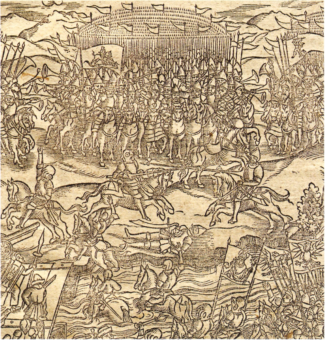 О форме казачьих знамён эпохи Смуты в условиях несохранившихся артефактов и изображений мы можем лишь строить догадки. Знамёна конных дворянских сотен и казачьих станиц — прямые наследники средневековых стягов княжеских и боярских дружин. В Средневековье воинские знамёна, за исключением немногих реликвий вроде французской Орифламмы, имели главным образом функциональный характер. Стяг обозначал, где находится командование войском, указывал всем воинам направление движения, собирал рассеявшихся в сражении воинов, указывал на победу или поражение своего войска. Ещё М.Г. Рабинович на материале древнерусских миниатюр сделал вывод о преимущественно функциональном предназначении стягов в изображениях средневекового войска9. В этом ключе следует рассматривать и символическое значение вздевания, поднятия или падения стягов в летописях и в древнерусской литературе. С наблюдениями Рабиновича полностью согласуются и наши: на древнерусских миниатюрах до XVI в. стяги реют почти исключительно над конными воинскими отрядами, либо сражающимися, либо двигающимися в походе, — например, на миниатюрах знаменитого Сильвестровского сборника (XII в.). В то же время элемент сакральности в отношении к стягам и знамёнам, вероятно, присутствовал уже в Средневековье, о чём свидетельствуют многочисленные примеры помещения на средневековые стяги и знамёна священных изображений. Но только в Новое время в эпоху наёмных армий воинское знамя само по себе становится воинской святыней вне зависимости от характера изображений на полотнище.