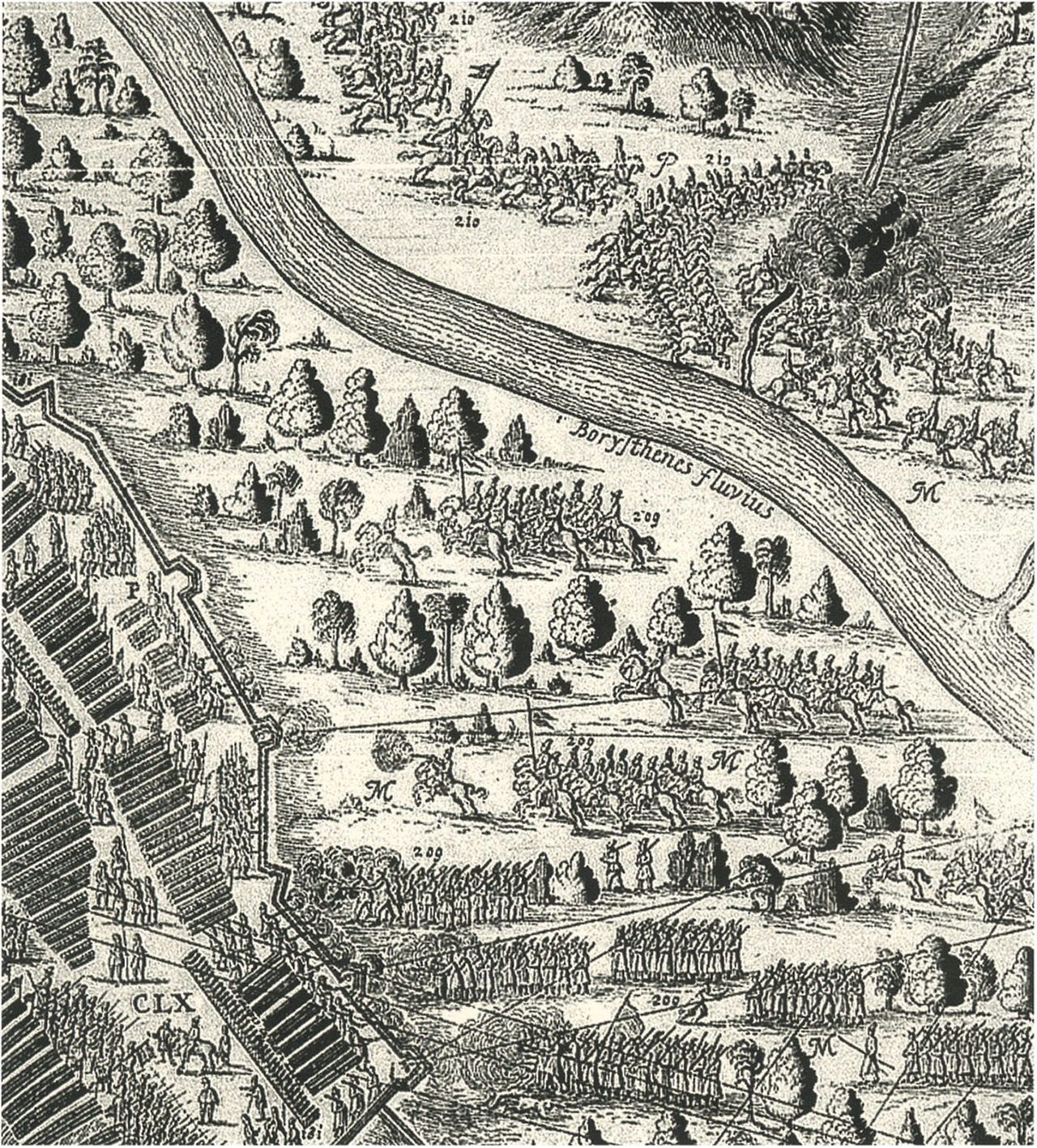 Первым из названных получил киндяк и четь киндяка контрастного цвета атаман Алексей Кухтин. Редкий для периода Смуты случай, когда упоминаются не только знамёна, но «признаки»17 на них. Наиболее вероятным символом по встречаемости на сохранившихся знамёнах и упоминаемых в документах, а также наиболее простым в исполнении был крест, как правило, шести- или восьмиконечный степенной, который являлся символом Московского царства, равнозначным двуглавому орлу18. Червчатый символ (степенной крест) горел на полотнище «ценинного» цвета, который относится к синему спектру.. Именно от наименования окрашенной и поливной керамики, судя по всему, и происходит это цветообозначе-ние, а отнюдь не от «цены» и «ценности» (см. подробный комментарий на стр. 8). Станица Алексея Кухтина присутствовала на смотре воеводами стольниками князем Дмитрием Мамстрюковичем Черкасским и князем Иваном Фёдоровичем Троекуровым своих пол-ков под Смоленском 25 декабря 1614 г.19 Под Смоленск полки Черкасского и Троекурова направились после взятия крепости Белая. Точная дата падения Белой неизвестна до сих пор, лишь недавно противоречивые датировки (даже год — sic!) этого события в историографии уточнены О.В. Скобелкиным20. Выступившие из Москвы под осень 1613 г. полки воевод и стольников князя Д.М. Черкасского и Михаила Матвеевича Бутурлина очистили от неприятеля Вязьму и Дорогобуж и осадили Белую, занятую шотландско-ирландским гарнизоном на службе короля Сигизмунда III. Здесь раненого в бою под крепостью Бутурлина и сменил князь Троекуров21, и с сеунчем о взятии Белой послали уже Черкасского с Троекуровым. В Москву бельские сеунщики приехали 13 сентября22, а 17 сентября 1613 г. жалованье за выход уже получали «бельские немцы» — перешедший на русскую службу гарнизон крепости23. Нам неизвестно, на каком этапе станица Алексея Кухтина присоединилась к войску князя Черкасского и связана ли названная выше дача материи с утратой прежнего знамени, но под новым знаменем казаки Кухтина могли оказаться под Смоленском не ранее конца июля 1614 г.