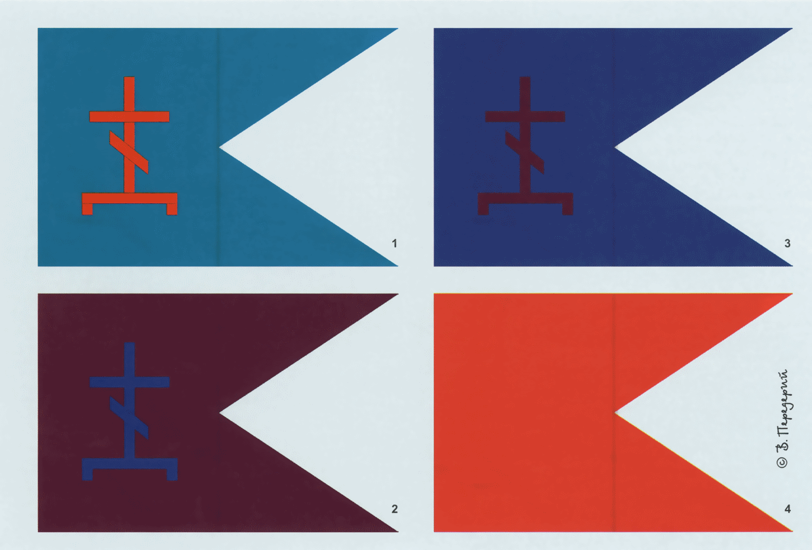2-3. Варианты реконструкции казачьих знамён станиц атаманов Фёдора Патрикеева и Степана Кузьмина, на которые атаманы получили материю в Казённом приказе 17 сентября 1614 г.