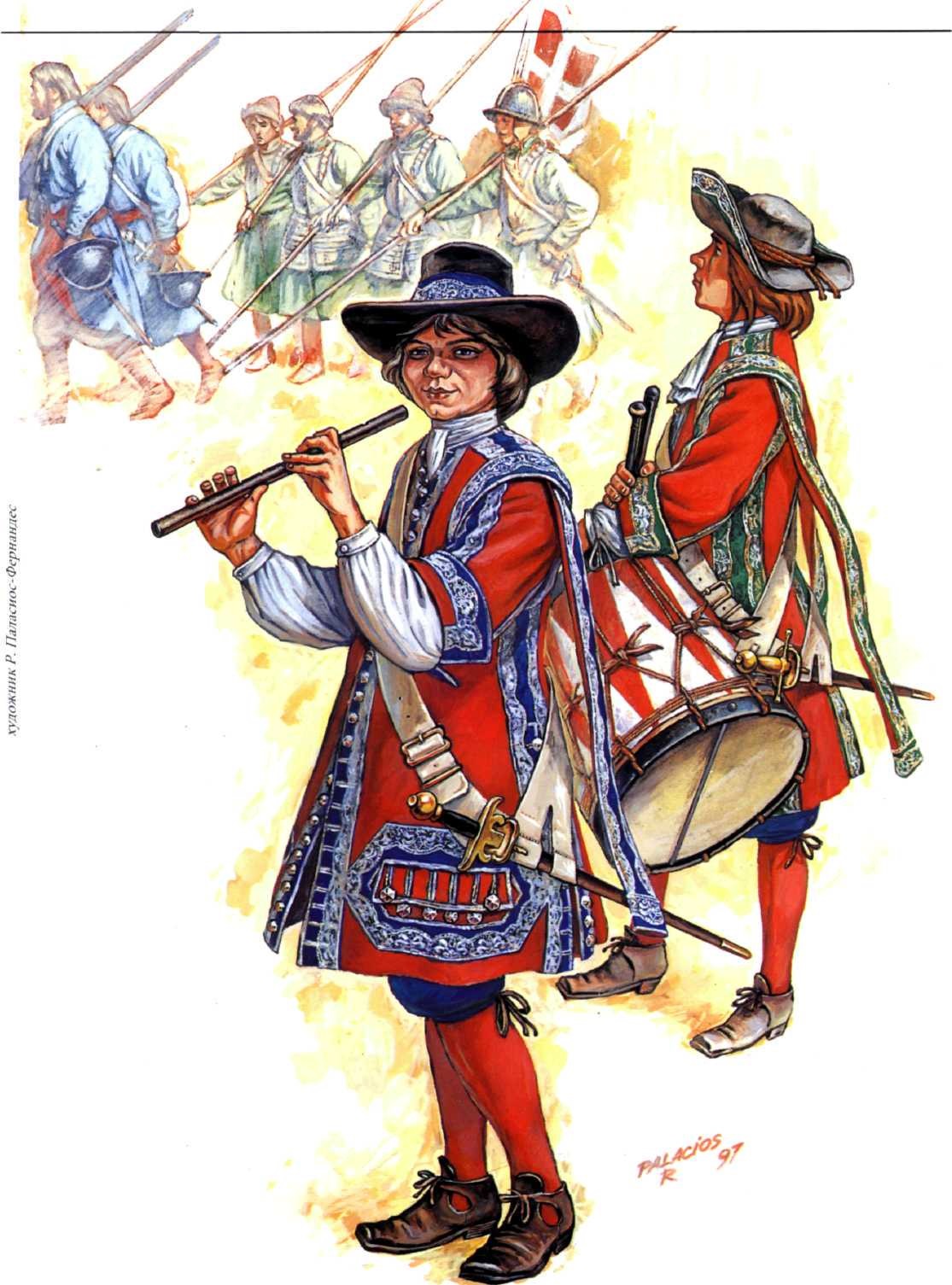 Барабанщик и флейтщик 1-го Выборного солдатского полка. На заднем плане — мушкетеры вторых и пикинеры первых тысяч московских солдатских полков.