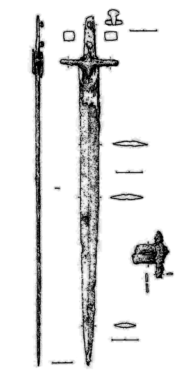 Между тем. среди материалов мусульманского Востока подобное оружие тоже известно; нам удалось отыскать два экземпляра. Первый был найден в пещере на горе Кызыл-Тас (Восточный Казахстан). Он представляет собой широкий обоюдоострый клинок, сечение которого имеет форму неравнобедренного треугольника. На клинке присутствует перекрестье в форме овального щитка с отходящими от него вверх усами. Рукоять венчает эллипсовидное навершие. Размеры находки: общая длина – 60 см. длина клинка – 45 см. ширина клинка у перекрестья - 6 см, у острия – 2 см, длина перекрестья – 13,5 см, размеры навершия - 0,62 х 0,28 см (Плотников, 1990. с. 150-151, рис. 1,1) (рис. 3, 9). Автор публикации Ю.А. Плотников датировал клинок достаточно широко: XII-XIV вв. (Плотников, 1990, с. 152). Второй клинок – это так называемый малый меч султана Мехмеда II (1432-1481 гг.), хранится в коллекции дворца Топкапы. Турция (рис. 3,10). Экземпляр представляет собой оружие с достаточно широким обоюдоострым клинком, с двусторонним долом, по которому с лицевой стороны золотой насечкой нанесена владельческая надпись. На клинке находится перекрестье узкоромбической формы с вытянутыми боковыми усами, которые на концах слегка уплотнены. Рукоять прямая, с костяными обкладками, которые фиксируются четырьмя заклепками и грибовидным навершием. Общая длина оружия – 81 ем. длина клинка – 61 см (Yucel. 2001, р. 130. pi. 89).