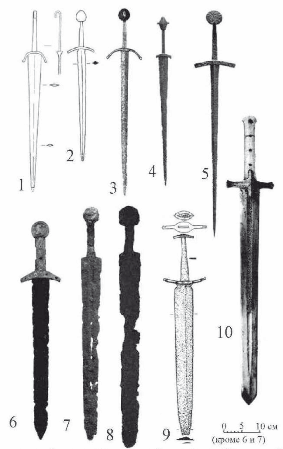 Рис. 3: 1 – кинжал короткий меч. найденный в г. Торопце. XIV-XVвв. (по: Кирпичников 1971); 2 – кинжал короткий меч. найденный в Подкарпатье, XVв. (no: Lewandowski 1986); 3 – кинжал короткий меч из коллекции Музея Немецкой Истории, в Берлине, XIV в. (по: Muller. Kólling 1981. 4 – кинжал короткий меч из бывшей коллекции Клайигбейла, Франция, середнії XIVв. (по: «Le musee fantastique» de Karsten Klingbeil 2011): 5 – кинжал короткий меч из р. Дордонь, юго-запад Франции. 1-я половина XVв.; 6 – кинжал короткий меч из собрания Фарусия. Сицилия. XII-XIII вв. (по: Mohamed 2008): 7 – кинжал/короткий меч который был продан на торгах аукционного дома Hermann Historica: 8 – кинжал короткий меч из несанкционированных раскопок в Восточной Европе (?): 9 – кинжал короткій меч из пещеры на горе Кызыл-Тас, Казахстан. XIVв. (по: Плотников 1990): 10 – малый меч султана Мехмеда II, 1432-1481 гг. (по: Yiicel 2001)