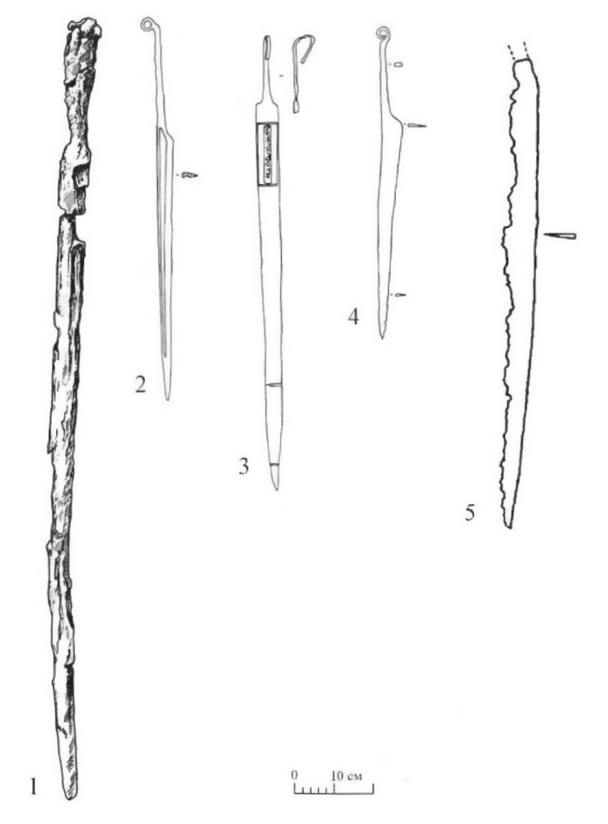 В то же время это не единственная находка кинжала столь внушительных размеров на территории Золотой Орды. Так, прямой кинжал с ромбовидным в сечении клинком общей длиною 39 см был найден в Булгаре в слое XIV в. (Савченкова, 1996. с. 69-70. рис. 32, 12) (рис. 2, 1). Еще один кинжал с узким лезвием общей длиной 43 см происходит из раскопок Укека (рис. 2.2) (Измайлов, Нсдашковский, 1993, с. 77, 83, рис. 3). Практически аналогичный предыдущему кинжал обнаружен в Измерском I селище, общая длина его сохранившейся части – 40,5 см (Измайлов, 1997. с. 55-56, рис. 28/3) (рис. 2, 3). Похожее оружие найдено в бывшем Спасском уезде Казанской губернии. Достаточно интересной его деталью являются кольца, которые крепились в районе перекрестья. Одно из них сохранилось с левой стороны, с правой сохранилось монтажное отверстие под еще одно кольцо, общая длина находки – 42.5 см (Измайлов. 1997, с. 55, рис. 28, 4) (рис. 2, 4). Кинжал рубежа XIV-XV вв. обнаружен в подкурганном погребении у ст. Новосвободной. Он представляет собой узкий клинок с рукоятью, оформленной серебряной фурнитурой, и серебряным высоким наконечником ножен, общая длина находки – 40 см (Днепровский, Носкова, 1991, с. 52, 54, рис. 2, 1) (рис. 2.5).