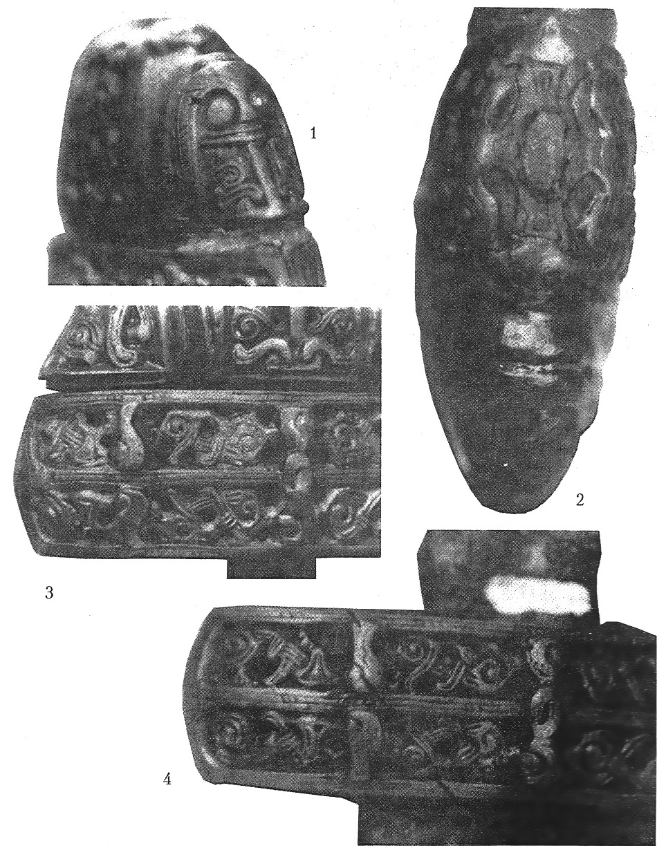 Детали рукояти меча из Гнёздова: 1 - головка навершия, вид сбоку; 2 - навершие, вид сверху, 3 - основание навершия, 4 - перекрестие.