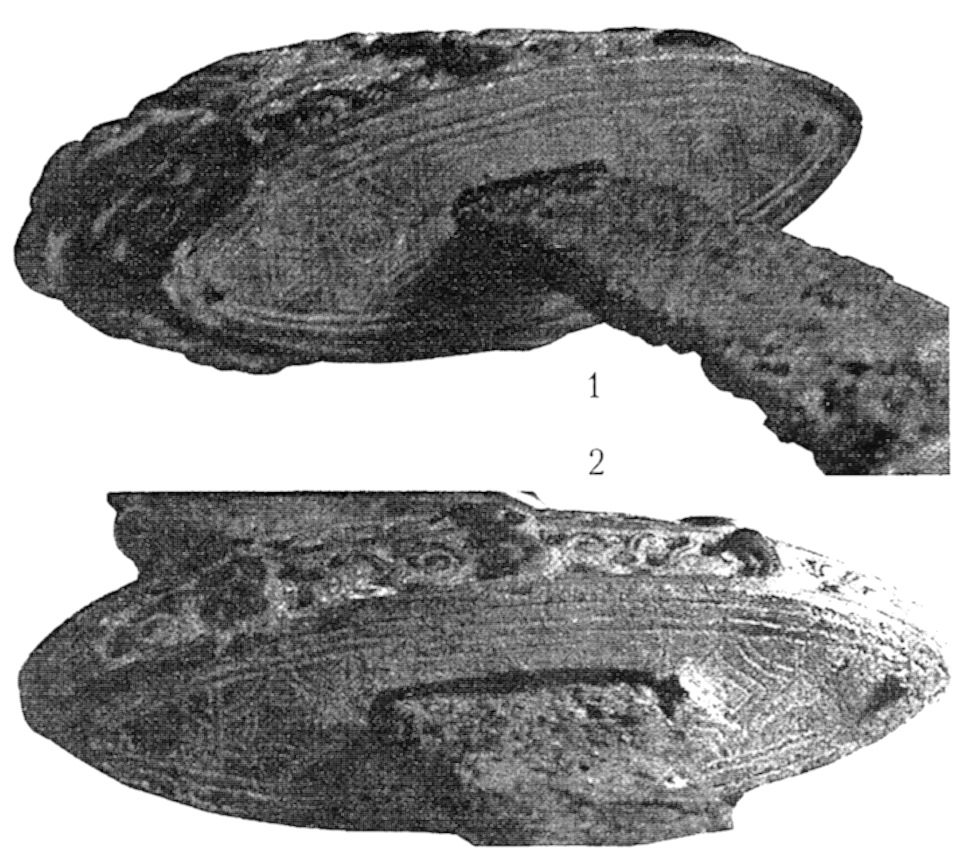 Перекрестье (1) и навершие (2). Орнамент на торцевых плоскостях. Прорисовка клейма меча.