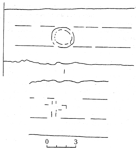 Х.Арбман, как упоминалось выше, считал меч северным, но склонялся к определению его производства в районе Смоленска. Л.Тунмарк-Нюлен этот вопрос не рассматривает и подчеркивает, что обсуждает только рукоять изделия. Здесь следует прибавить следующее новое наблюдение. В 1998 г. авторами во время работы в Смоленском государственном историко-архитектурном музее-заповеднике удалось произвести осторожную расчистку зоны клейма рассматриваемого меча. Клинок сохранился плохо, он поражен глубокой коррозией. Несмотря на это, в зоне дола на расстоянии 4-7 см от перекрестья удалось выявить: на одной стороне клинка О-образный знак, на другой – остатки креста. Меты были выполнены, по-видимому отрезками железной проволоки. Знаки сохранились фрагментарно, по большей части утратили чистый металл, но следы оконтуривающих их сварочных швов оказались видными (рис. 4). Других знаков по соседству с выявленными обнаружить не удалось. Приближенность фигур к перекрестью также свидетельствует о том, что они на каждой из сторон дола лезвия были одиночными.