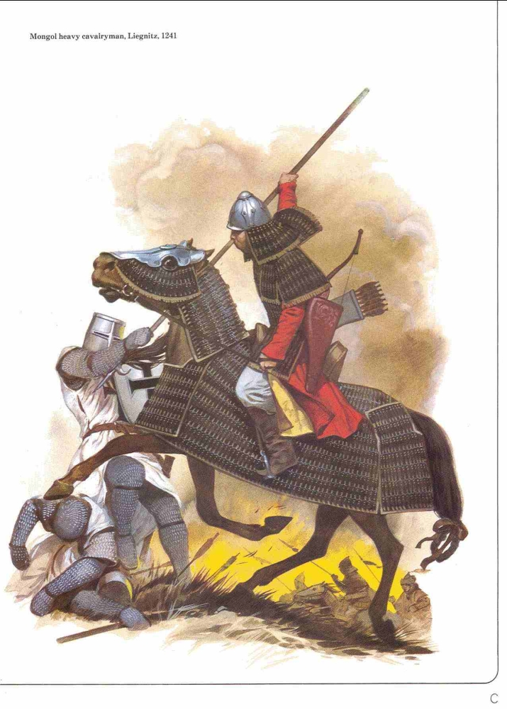 Монгольский тяжеловооруженный конник, Лигниц, 1241 г.Так, по мнению В.В. Горбунова, только стабильность находок копий может свидетельствовать в пользу массового применения копейного боя в целом, а их устойчивая дифференциация, указывать на тактическое различие конных формирований. Правда, стоит отметить, что А.Р. Артемьев считал, что найденные на древнерусских городищах, погибших во время монгольского погрома, наконечники пик (около пятидесяти экземпляров) принадлежали именно нападавшим. Но на данный момент это подтвердить достаточно сложно, так как памятники Приморья не дают схожего материала. А если все же допустить, что со временем это и произойдет, то приписать пики тяжеловооруженной коннице будет достаточно сложно, так как их концентрация именно на городских памятниках не может свидетельствовать в пользу принадлежности этих находок последней.