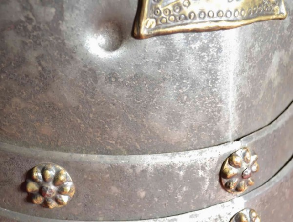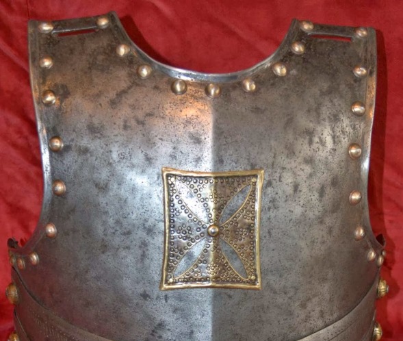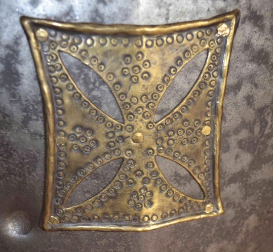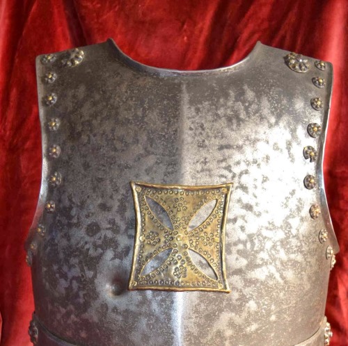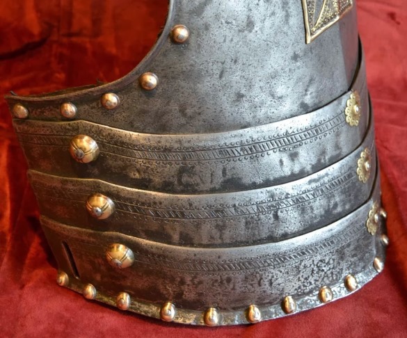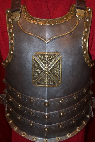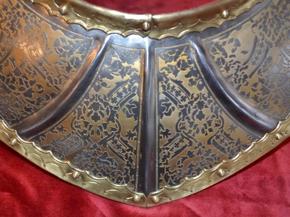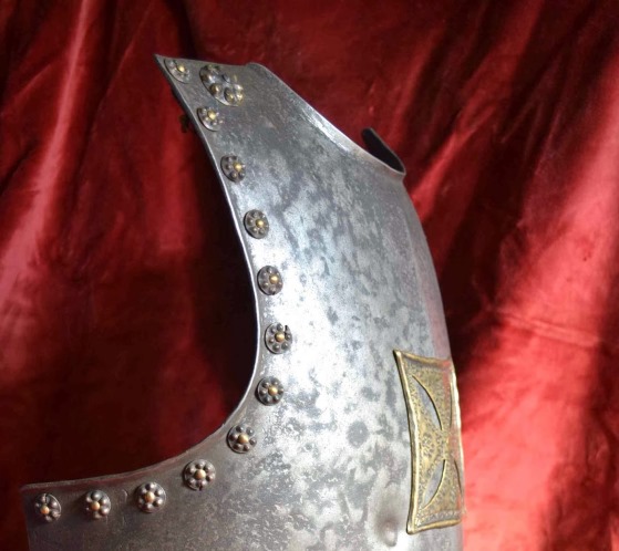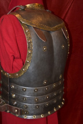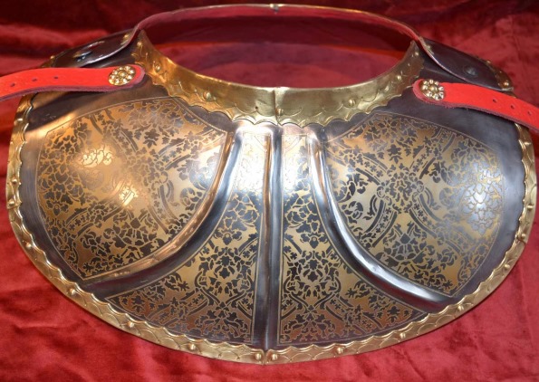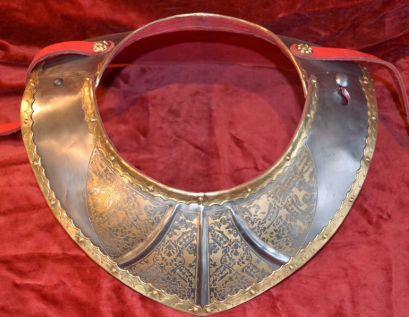 В комплект кирасы входит горжет – защита ключицы. Все детали богато украшены инкрустацией латунью. По заказу можно провести искусственное старение изделия, даже сделать "старый" след от пули.