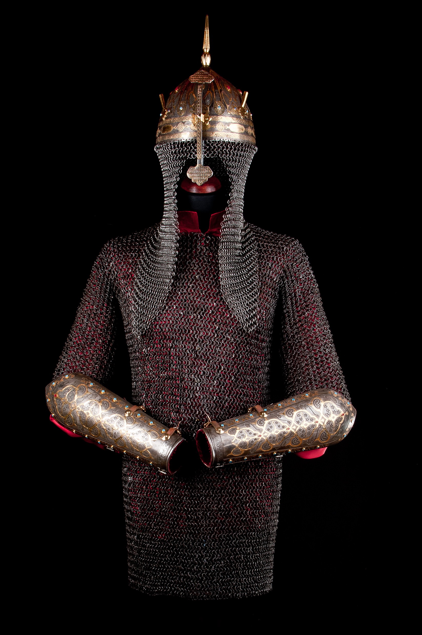 Данный набор доспехов характеризуется высочайшим качеством изготовления. К работе над ним наша группа мастеров подходила как над произведением ювелирного искусства. Все детали начиная от 35 тысяч склепанных колец кольчуги до лопастей наручей изготовлены очень тщательно. Применены техники: травления, золочения, инкрустации металла. Для украшения были использованы полудрагоценные камни коралл и гранат.