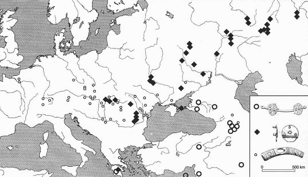 В эпоху бронзы впервые возникает международная воинская культура, свидетельствующая об интенсивных взаимоотношениях и активном взаимовлиянии различных групп воинов по всей Европе. Это можно иллюстрировать с помощью карт распространения разных типов мечей, — например, мечей с языкообразной площадкой для крепления рукояти или мечей с литой восьмигранной рукоятью XV и XIV веков до. н. э., объединяющих Данию с Южной Германием и Центральной Европой (ил. 8). Кроме того, картирование наглядно демонстрирует, что некоторых женщин использовали для установления политических союзов между локальными группами и налаживания мирных отношений, которые были необходимы для торговли металлами и позволяли торговцам и воинам безопасно передвигаться между соседними группами. Ил. 8 показывает, среди прочего, что мужчины-воины гораздо чаще покидали дом и удалялись от него на более длинные дистанции.
