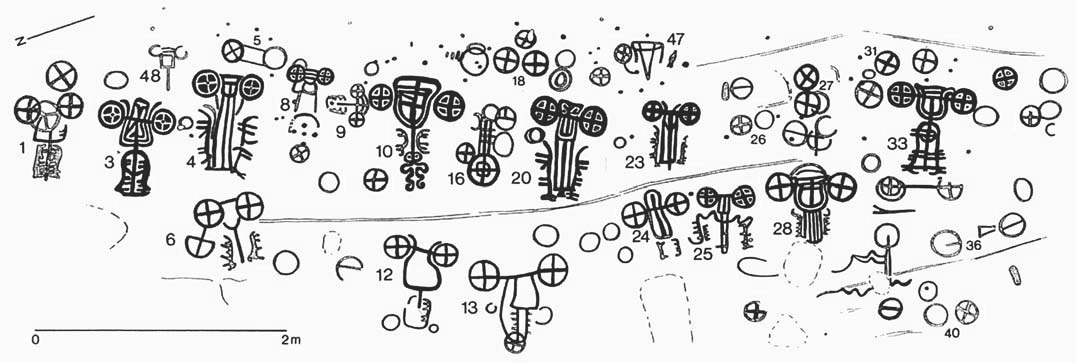 | Ил. 2. Распространение псалиев конской сбруи боевых колесниц между 2000 и 1600 гг. до н. э. | Ил. 3. Наскальный рисунок из Френарпа в Южной Швеции с изображением боевых колесниц |
