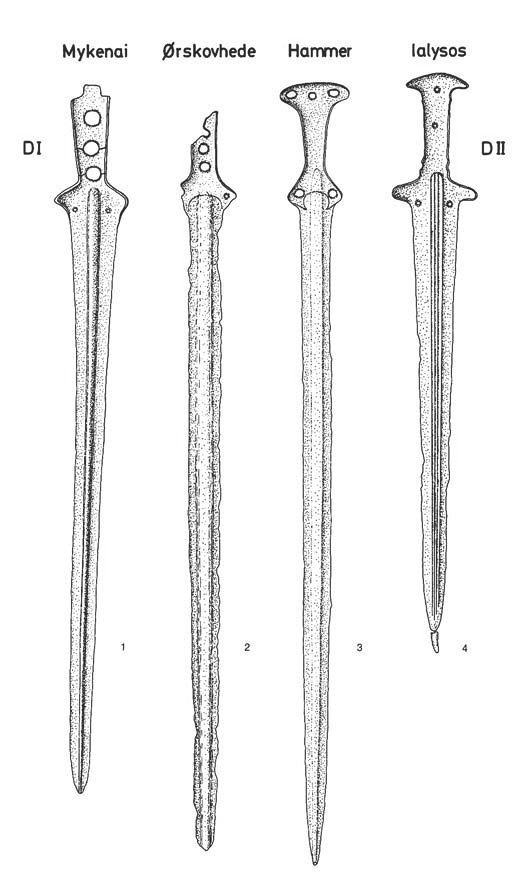 Исторически доказано, что на службе у римлян состояли германские и кельтские наемники, возвращавшиеся после службы на родину с римским оружием и римскими товарами, обладание которыми обеспечивало престиж в обществе. Поэтому наличие в восточной части Центральной Европы XIV и XIII веков до н. э. греко-микенского оружия вполне можно интерпретировать как доказательство возвращения наемников после службы на микенских территориях. Подтверждением того же могут быть и центрально-европейские, прежде всего италийские, мечи с языкообразной площадкой для крепления рукояти, найденные в зоне микенских дворцов, а также керамика, изготовленная в традициях родных мест пришельцев, — например, сосуды, напоминающие италийские и обнаруженные в Восточном Средиземноморье.