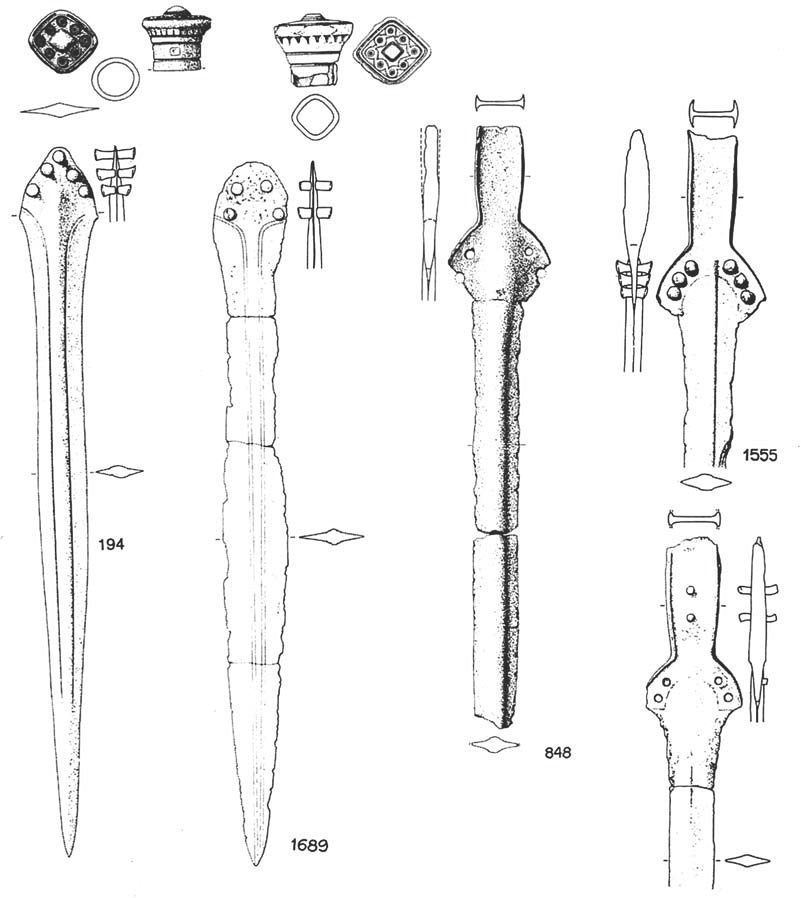 Новая военная аристократия отличалась от соплеменников одеждой и ухоженным видом. Появилась потребность в бритвах и пинцетах, которые помогали этот вид поддерживать, кроме того, новая элита щеголяла в роскошных шерстяных плащах (ил. 1). Не будет ошибкой считать, что военное дело как профессия активно развивается с эпохи средней бронзы. Статус воина был особенно притягателен для юношей, что заставляло их отправляться на службу наемниками в весьма отдаленные местности. На кладбище в Неккарзульме в южной Германии более трети мужских погребений, даже не имеющих в погребальном инвентаре оружия, — это останки неместных, пришлых мужчин. Глобализация выразилась и в широком распространении новых типов мечей. Так, меч с языкообразной площадкой для крепления рукоятки за период от 1500 до 1100 года до н. э. распространился из Скандинавии до Эгейских островов, что говорит об интенсивном обмене знаниями в области военной и боевой практики, а также о дальних путешествиях воинов и наемников (ил. 2).