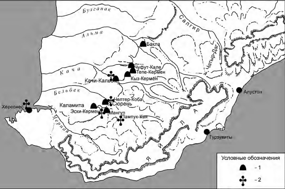 1-2, 4-6 — окрестности Мангуп-Кале; 3 — окрестности монастыря на Качи-Кальоне; 7 — окрестности монастыря Челтер-Коба; 8 — Бельбекская долина; 9-10 — крепость Пампук-Кая