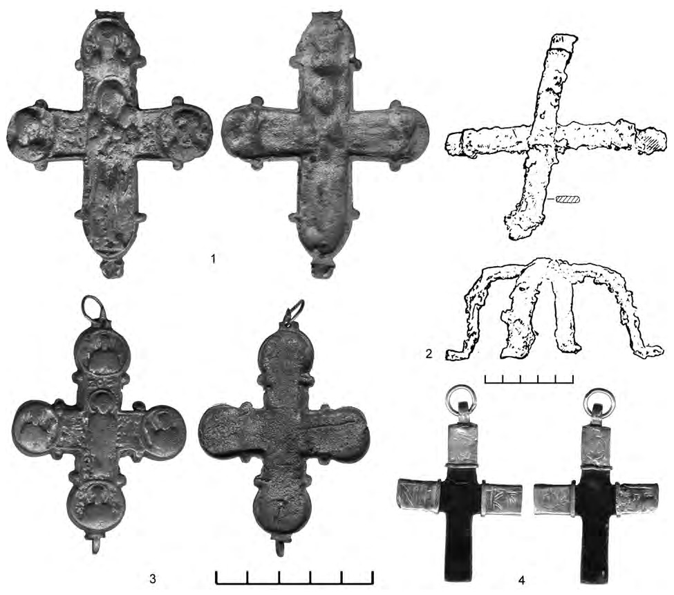 В 1853 г. около церкви св. Константина А.С. Уваров раскопал четыре гробницы (Уваров 1910: 14). В 90-х годах XX в. исследование некрополя было продолжено Мангупской археологической экспедицией СГУ. В храме были открыты две вырубленные в материковой скале гробницы, прямоугольной в плане формы. Под северной стеной ближе к входу в храм находилось естественное углубление в скале, также использовавшееся как место для захоронений. Позднейшее из погребений было, по определению антропологов, мужское, возраст погребенного — более 60 лет. Присутствие в могиле звездицы, используемой в литургии, бесспорно свидетельствует о том, что погребение принадлежало священнику. Кроме звездицы (рис.2: 2) в могильной яме был обнаружен наперсный крест из полированного зеленого камня, предположительно яшмы (рис. 2: 4). На концах ветвей креста — серебряные обоймицы с гравированными надписями под титлами: на одной стороне IC (верхняя ветвь), [XC] (нижняя ветвь — обоймица не сохранилась), NI (левая ветвь), KA (правая ветвь), на другой стороне Ф (верхняя ветвь), ωС (левая ветвь), [Ζω] (нижняя ветвь — обоймица не сохранилась), Н (правая ветвь). Последняя представляет собой архаичную христианскую формулу: «Свет, жизнь», прилагаемую ко Христу, которая в греческой традиции сохранилась до развитого средневековья.
