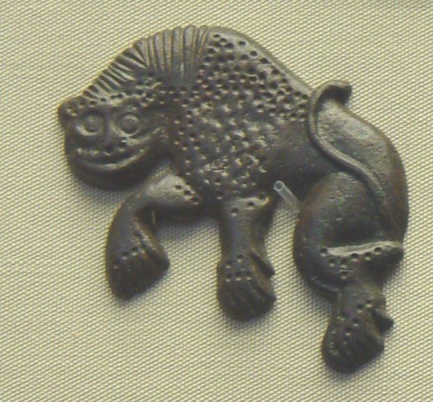 - Лев влево, Коринф, Греция, культурный слой византийского времени, пластина (Davidson 1952: 934, pl. 68), бронза, дл. 5,4 см.