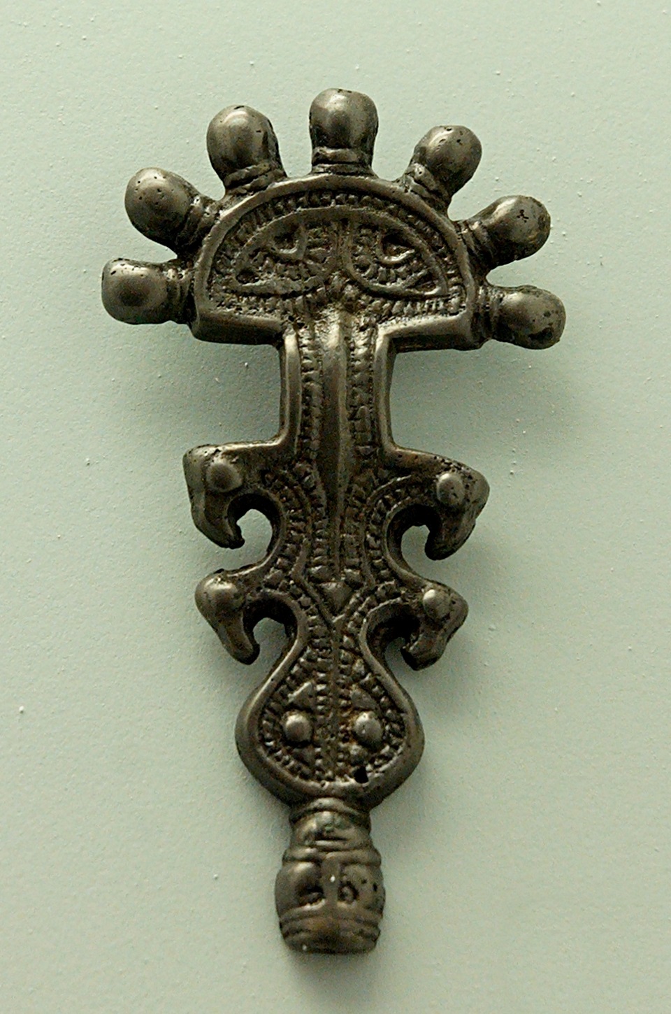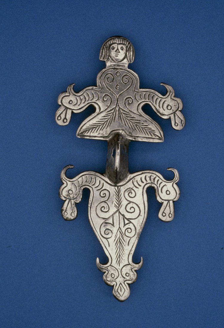 - Бородатый человечек анфас, тело оформлено, как щиток пряжки или фибулы, Велестинский клад (Werner 1953: Taf. 3: 7).
