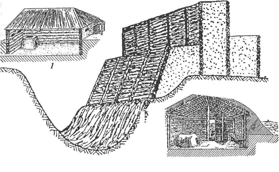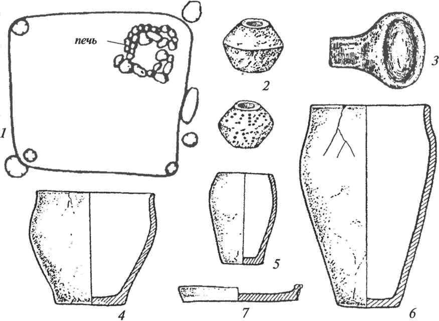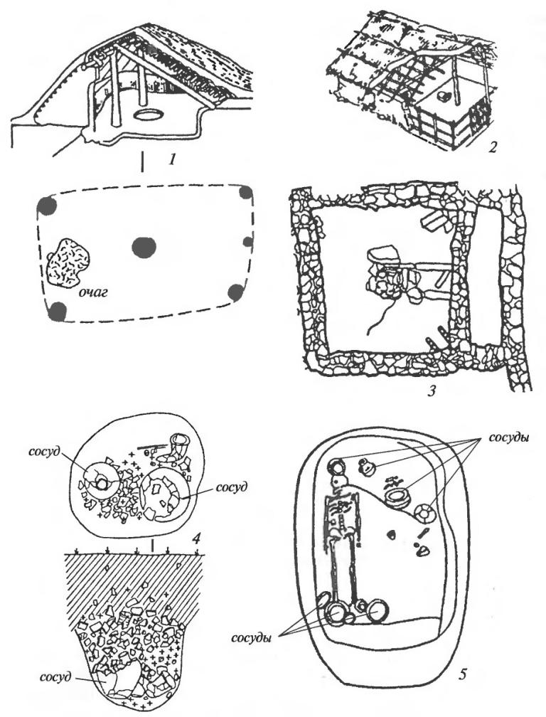 — жилые дома (квадратные полуземлянки или наземные с небольшим углублением — северо-западный ареал) с печкой-каменкой (реже глиняной) в одном из углов постройки (восточные и южные ареалы) или очагом (северо-западные ареалы);