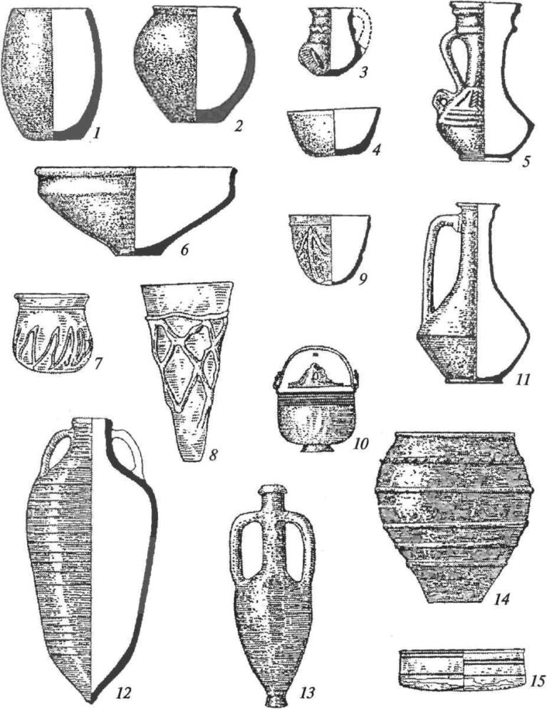 Предметы материальной культуры. Основная масса находок — это фрагменты различных глиняных сосудов: горшков, мисок, кувшинов, ваз, кубков. Формы сравнительно немногочисленных лепных сосудов показательны для разных культурных традиций или подражают формам круговых. Столовая посуда отличается тщательной выделкой, часто ее украшали налепными валиками, желобками, врезными горизонтальными линиями, реже использовали каннелюры, волнистый или штампованный орнамент. Отдельные образцы лощеных сосудов, очевидно, являются подражаниями привозным металлическим сосудам. Среди посуды на Черняховских памятниках довольно часто встречаются причерноморские амфоры, в которых привозилось масло или вина. Кроме того, имеются отдельные находки красноглиняной и краснолаковой посуды, вышедшей из провинциальных римских мастерских. Интересную группу сосудов составляют тонкие глиняные кубки полуяйцевидной формы со штампованным орнаментом — местные подражания римским стеклянным сосудам. Только на поселениях находят корчаги и пифосообразные сосуды, сделанные из грубой глины и предназначенные для хранения припасов. Найдены несколько сосудов, поверхность которых украшена сложной системой изображений, возможно, связанных с календарными циклами и имевших ритуальное назначение.