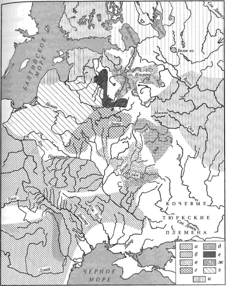 а — пражско-корчакская культура; б — пеньковская культура; в — колочинская культура; г — тушемлинская культура; д — мощинская культура; е — ареал культуры ранних длинных курганов; ж — ареал культуры сопок; з — балтские племена; и — финские племена