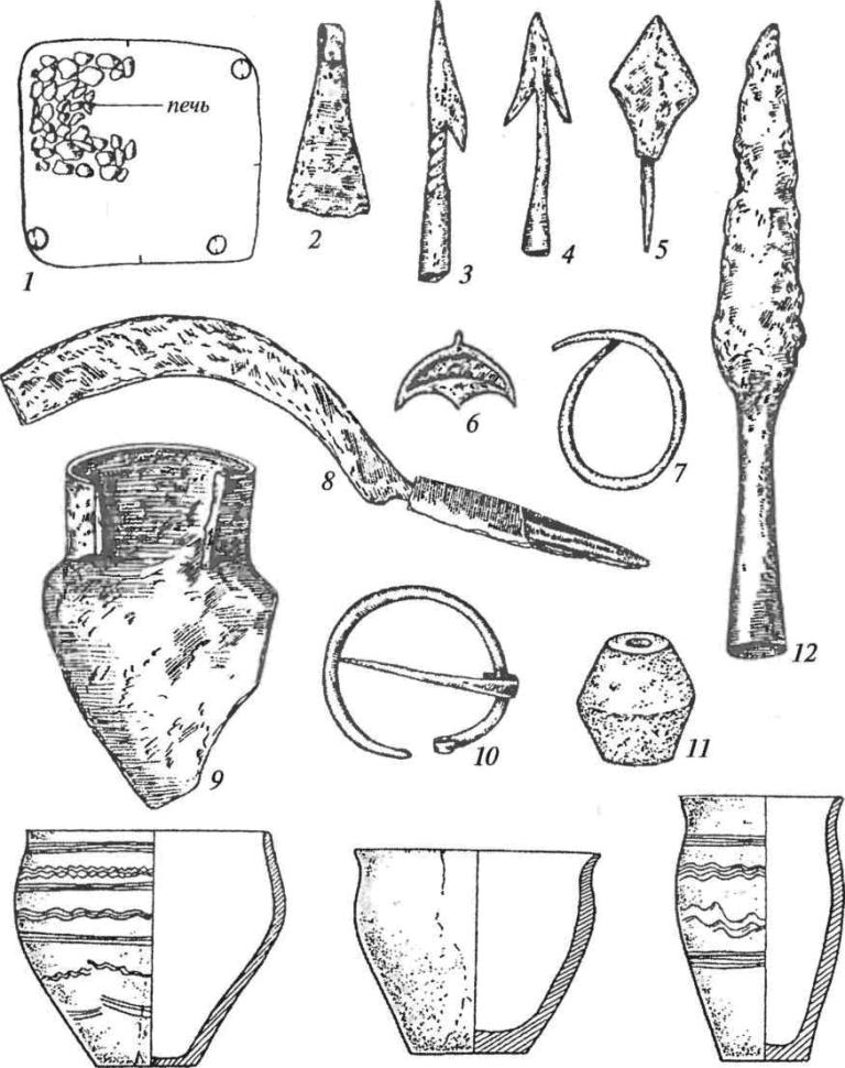 Хозяйство. Поселения всегда расположены на удобных для обработки землях. Основу хозяйства составляло земледелие. Использовались рала с небольшими железными наральниками и деревянные рала без железных наконечников, которые были наиболее пригодны для вспашки черноземных земель. Иногда для обработки пахотного участка использовались небольшие железные и костяные мотыжки. Выращивали пшеницу, просо, ячмень, овес, для уборки которых применяли железные слабоизогнутые серпы. Животноводство стояло на втором месте по значению. Разводили крупный рогатый скот и свиней, мелкий рогатый скот; кости лошадей встречаются редко. Для заготовки кормов использовались косы-горбуши. Судя по незначительному количеству находок рыболовных крючков, а также костей рыб и диких животных, рыболовство и охота играли незначительную роль в жизни населения.